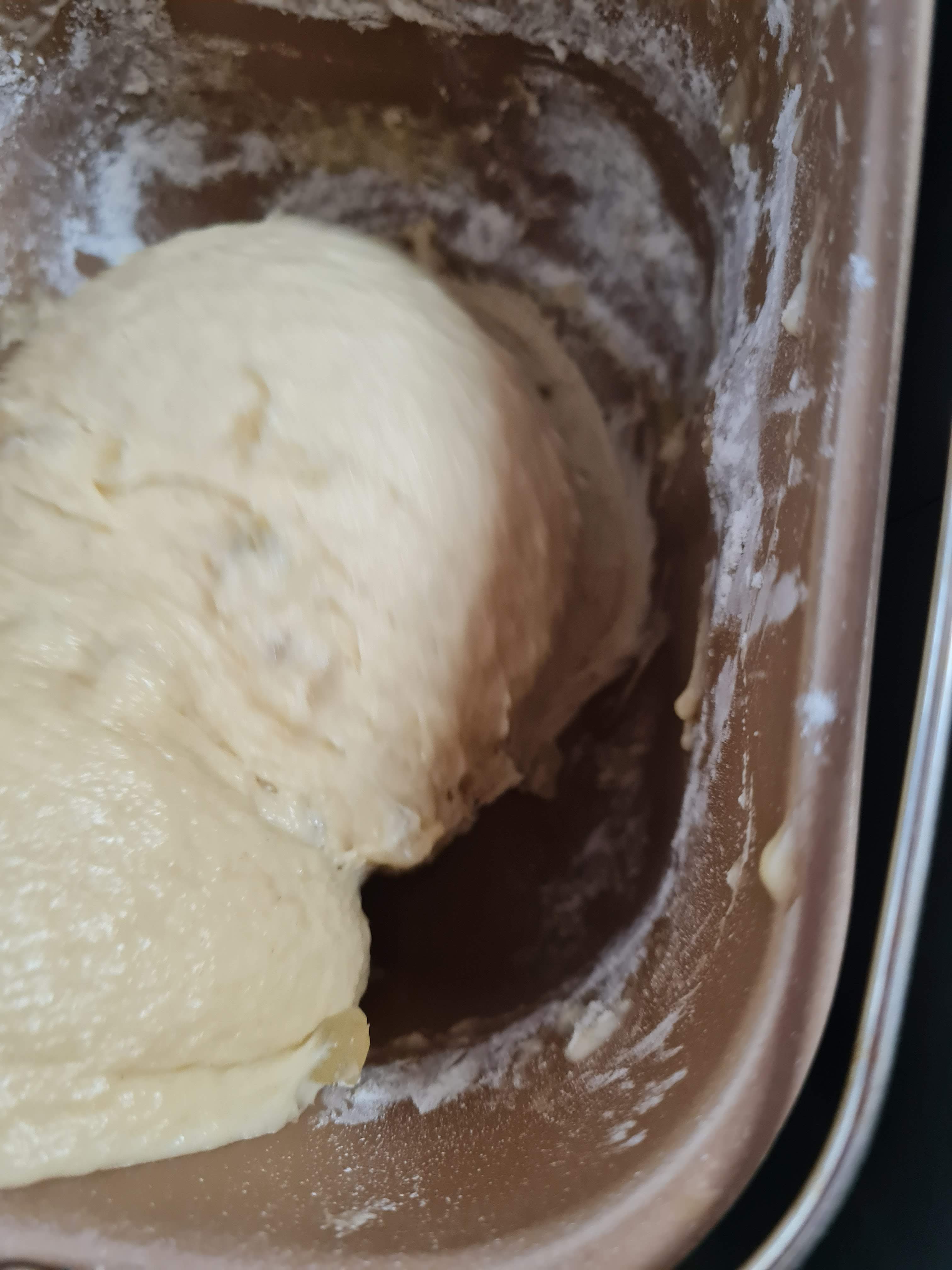 Когато програмата свърши я пускам отново. Но държа капака отворен и започвам лъжичка по лъжичка да добавям от останалите 100 г от брашното. А накрая.ая се добавят и стафидите. Програмата продължава 15 минути и за това време брашното свърши.