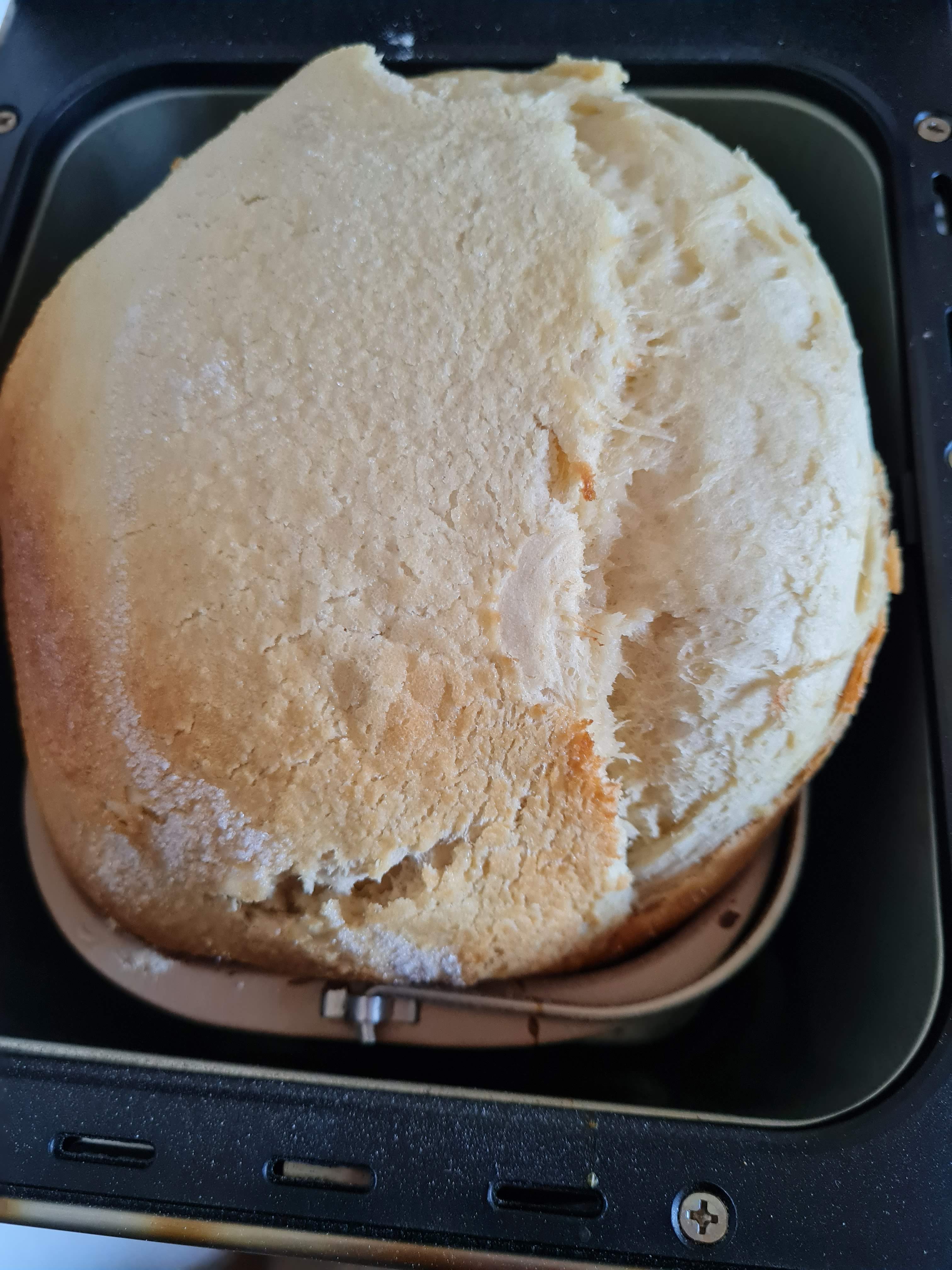 Когато машината даде сигнал, че печивото е готово, отворям и какво да видя – моят козунак е огоромен, но бял отгоре и мек на пипане. НЕДОПЕЧЕН Е!