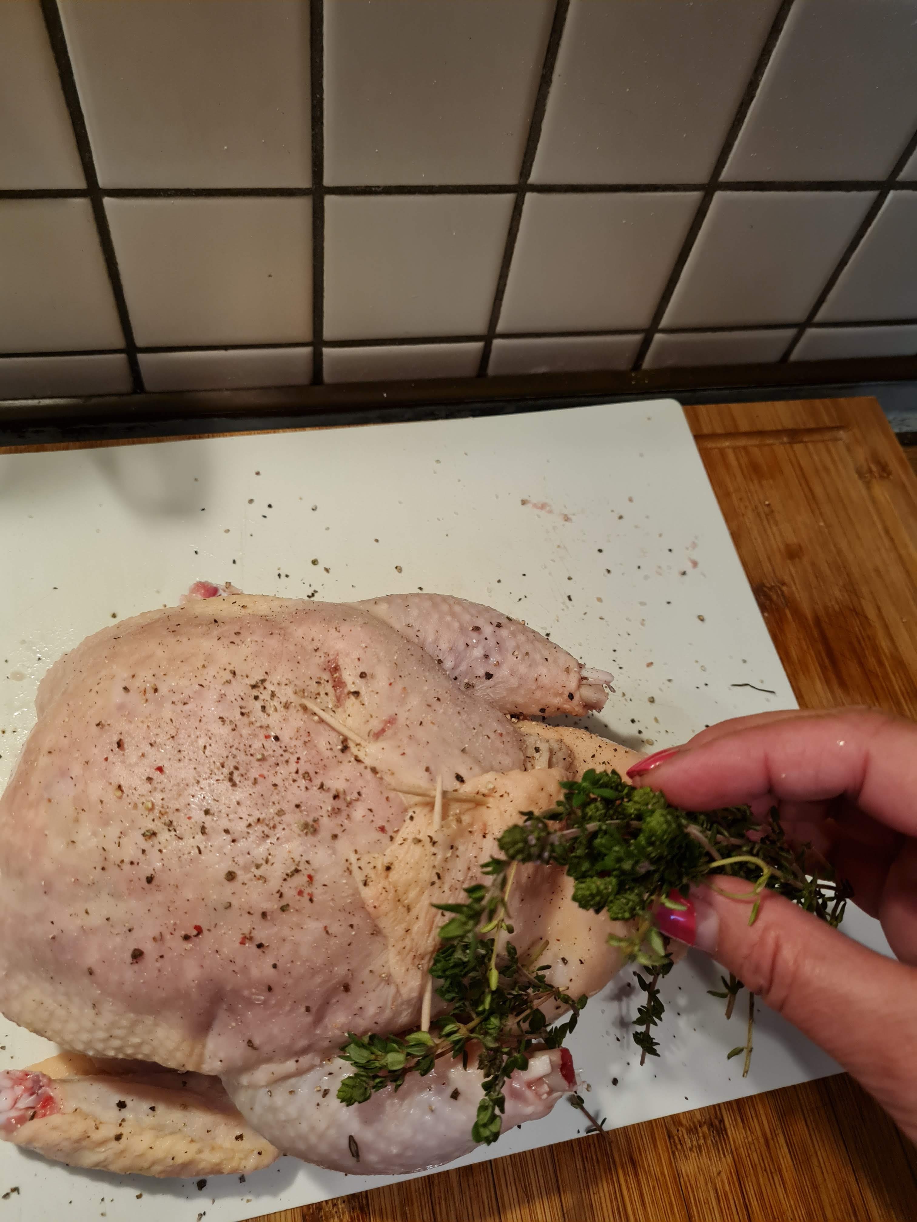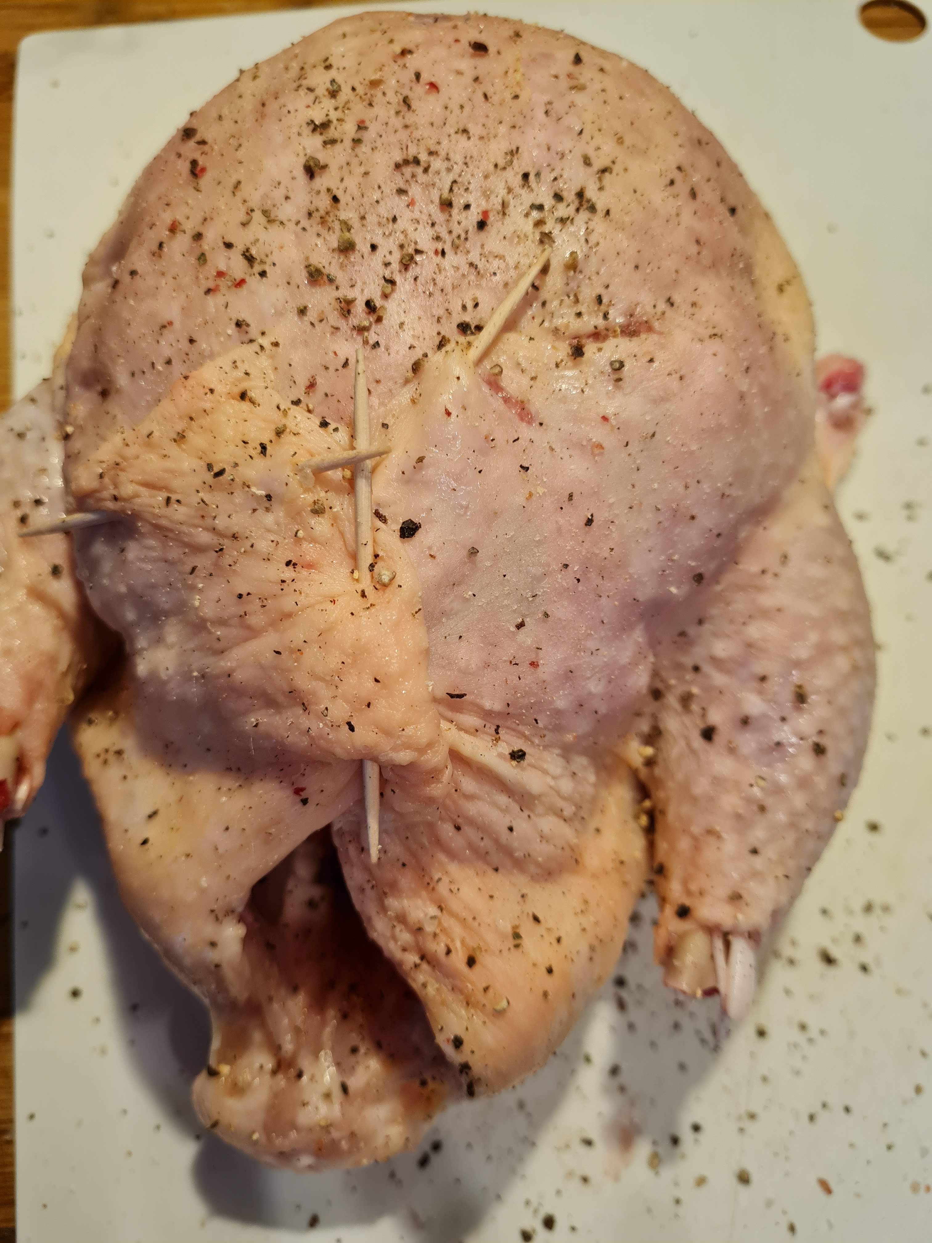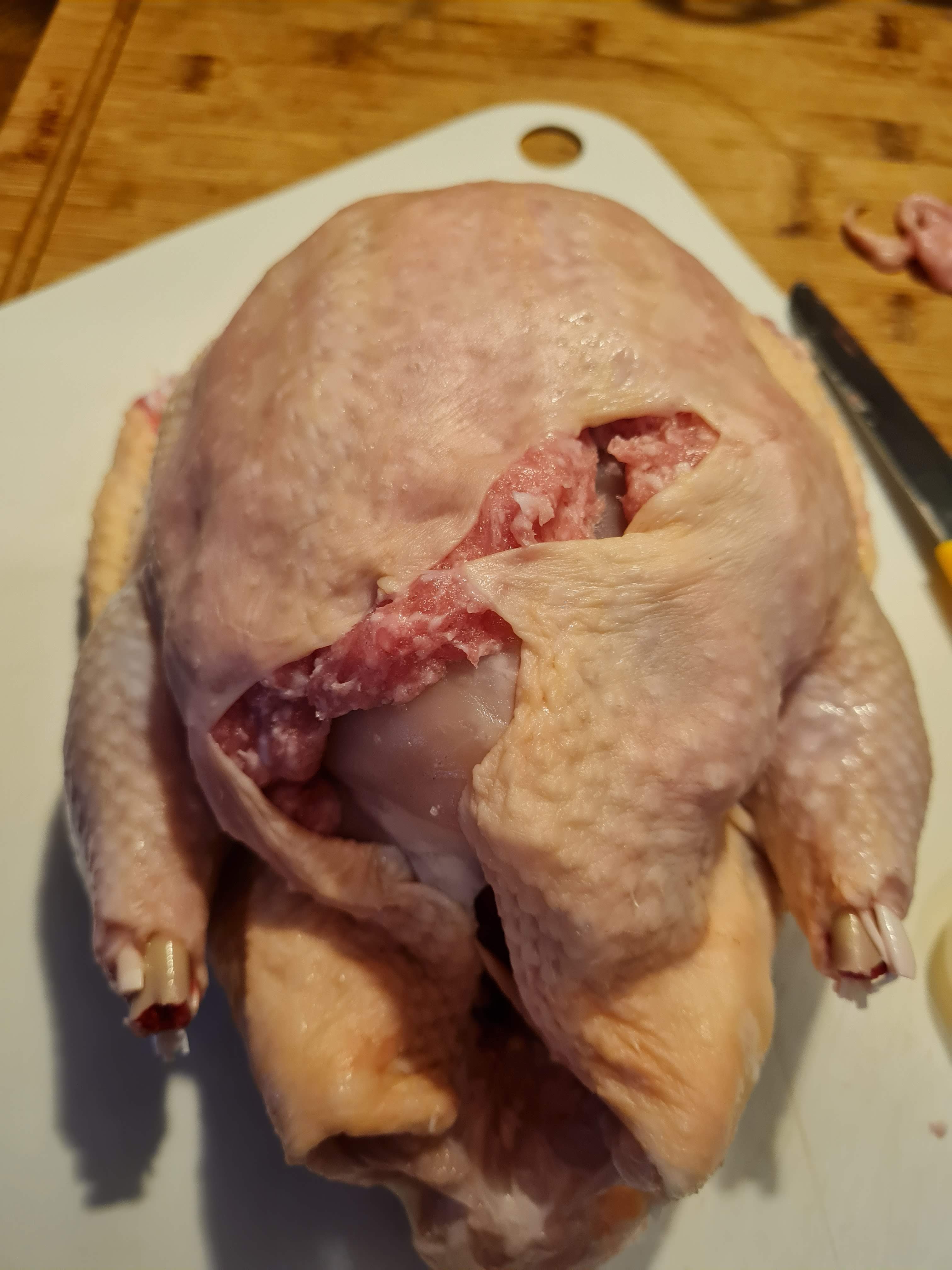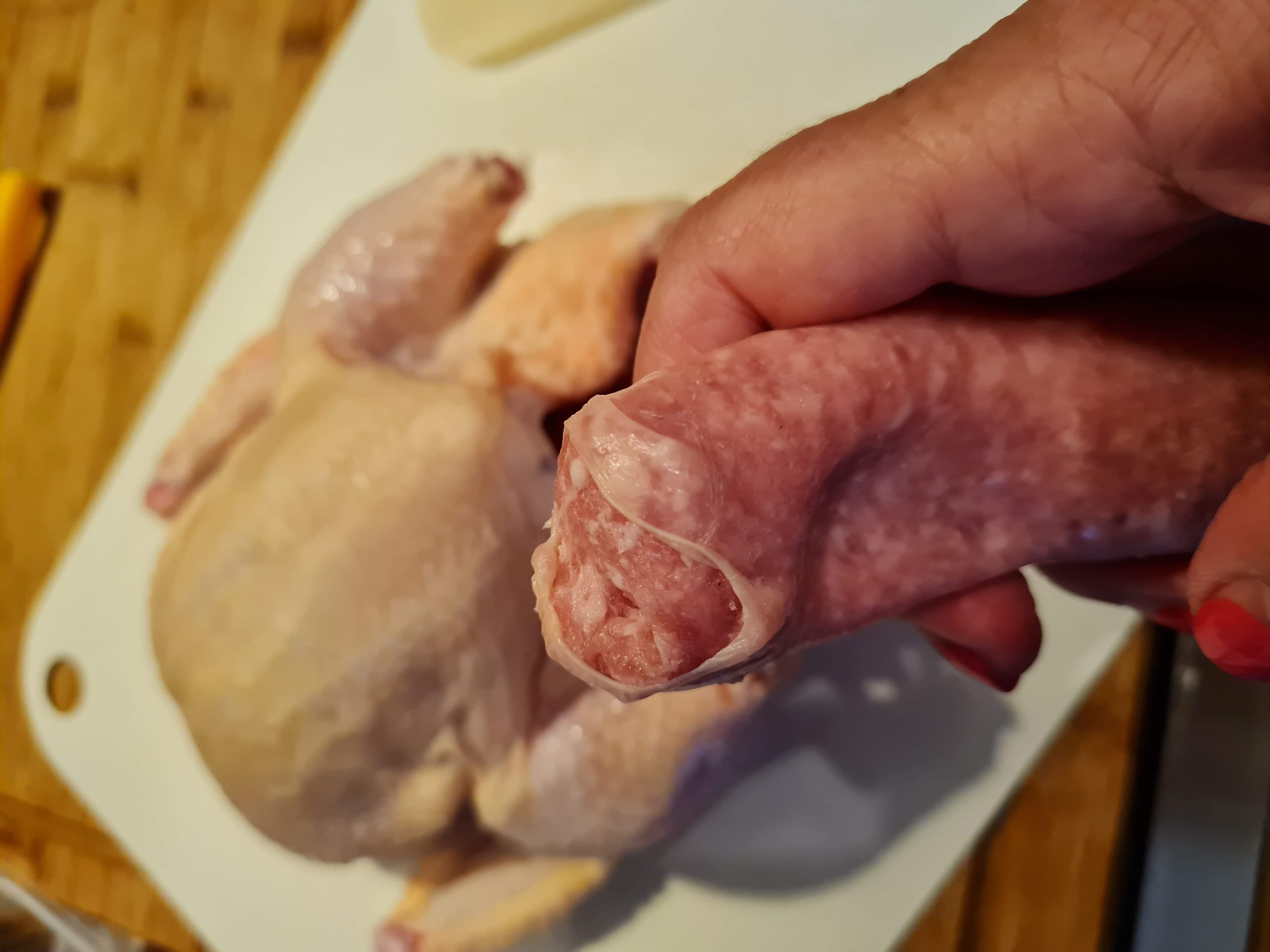 За целта го почиствам много добре, дори с пинсета изваждам останалите перца, почиствам много добре трътката (дано знаете как се прави), отрязвам крилцата винаги, а днес резнах и края на бутчетата. Там винаги остава нещо, което не може да се почисти и е по-добре да се резнат.