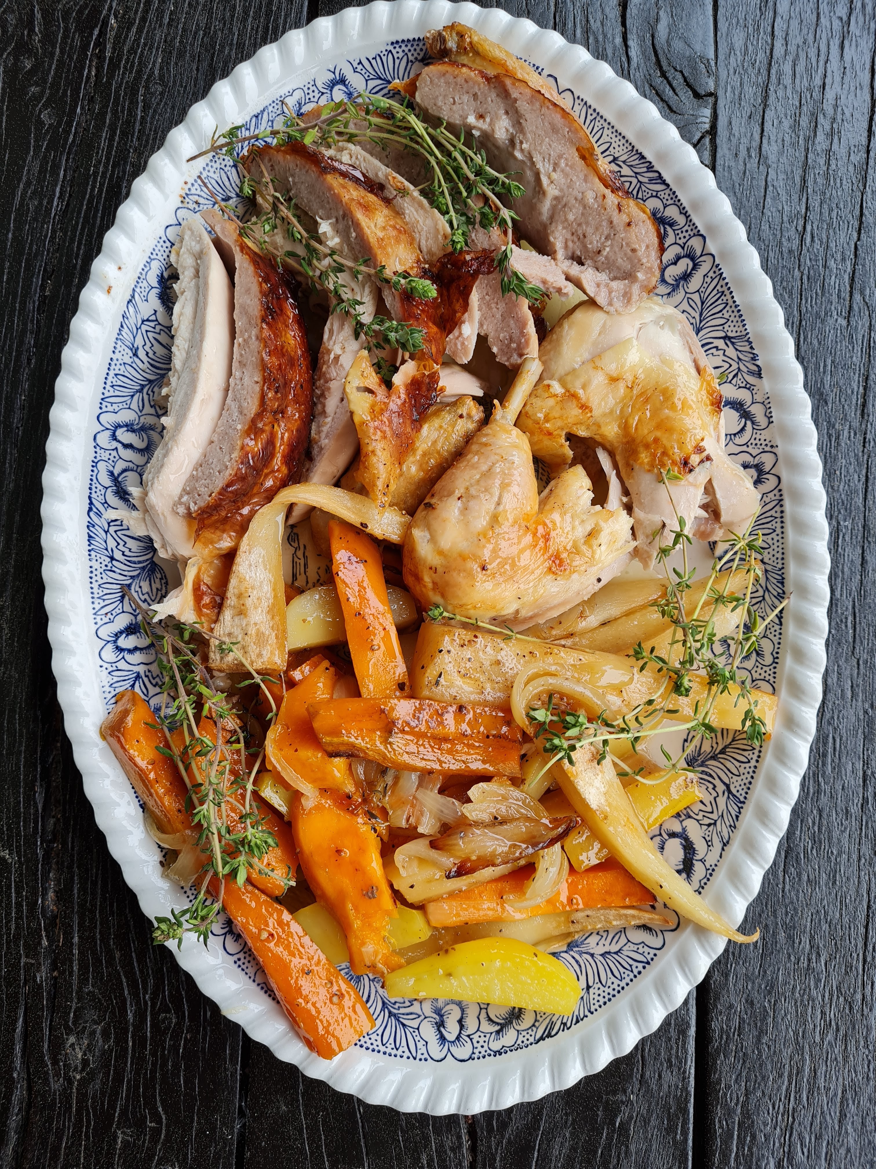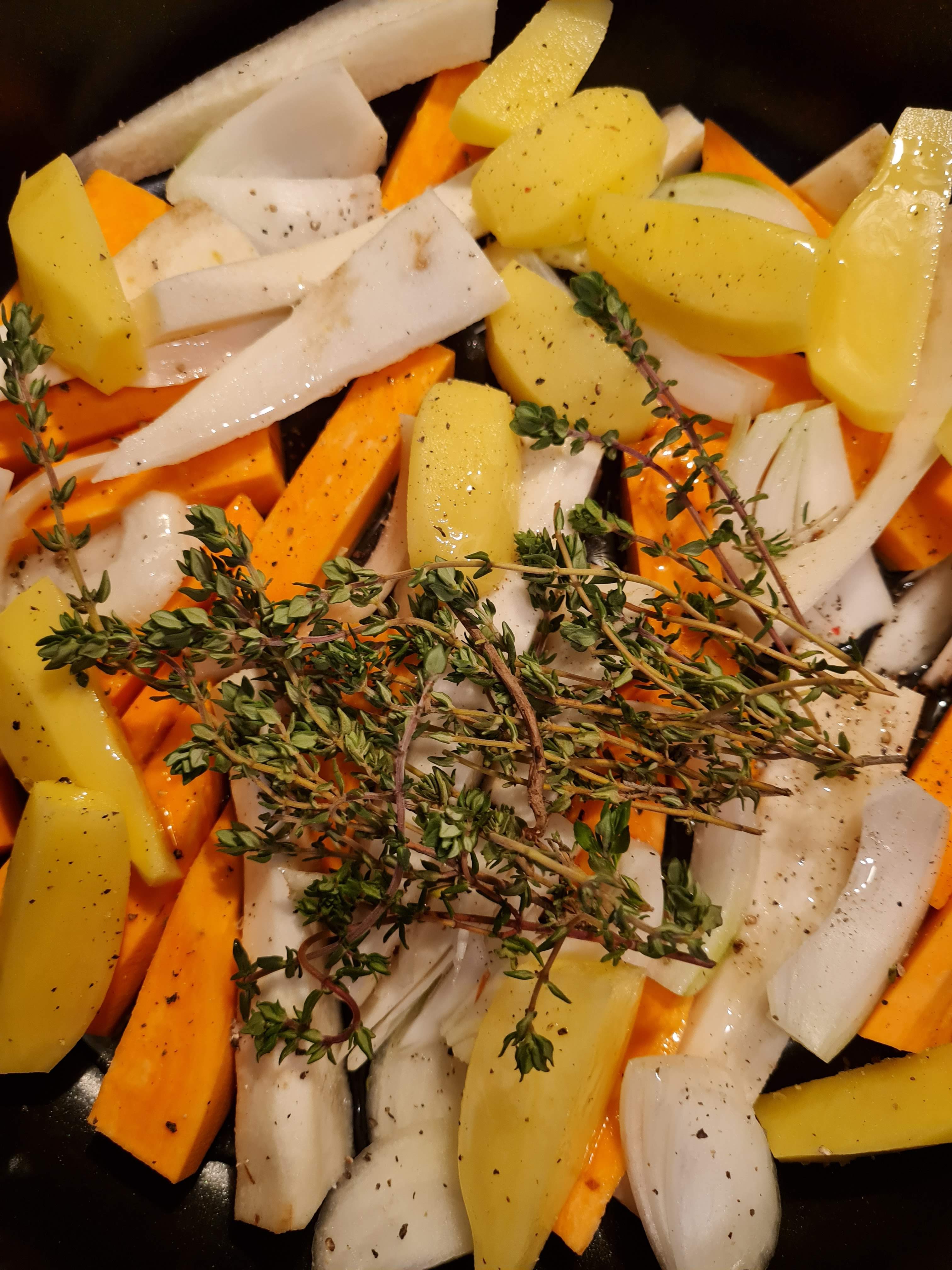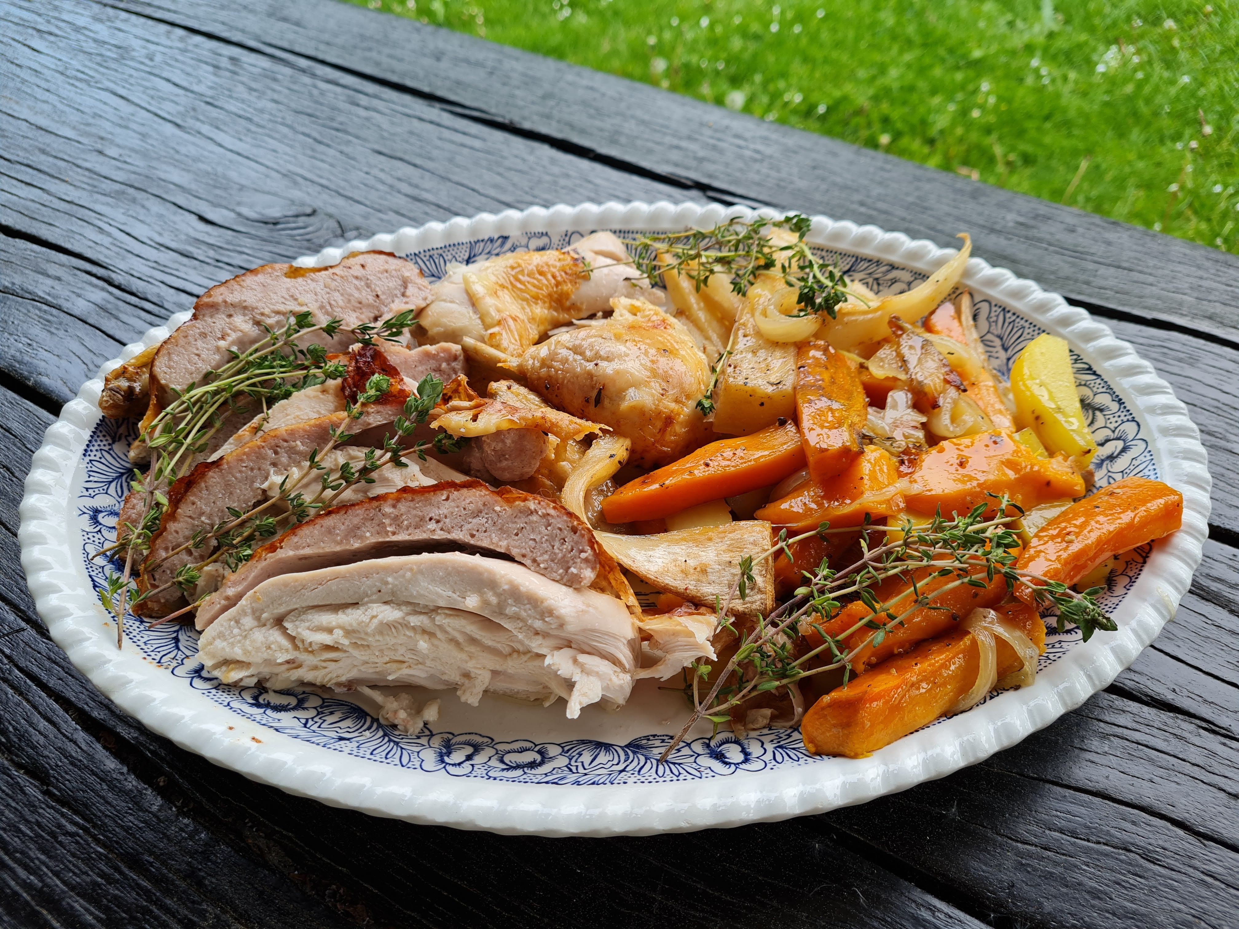 Сигурна съм, че и Вие ще останете доволни от тази невероятна комбинация от пиле и сурови наденички. А пък зеленчуците към тях – сладък картоф, картоф, пащърняк и кромид лук допълваха ястието.