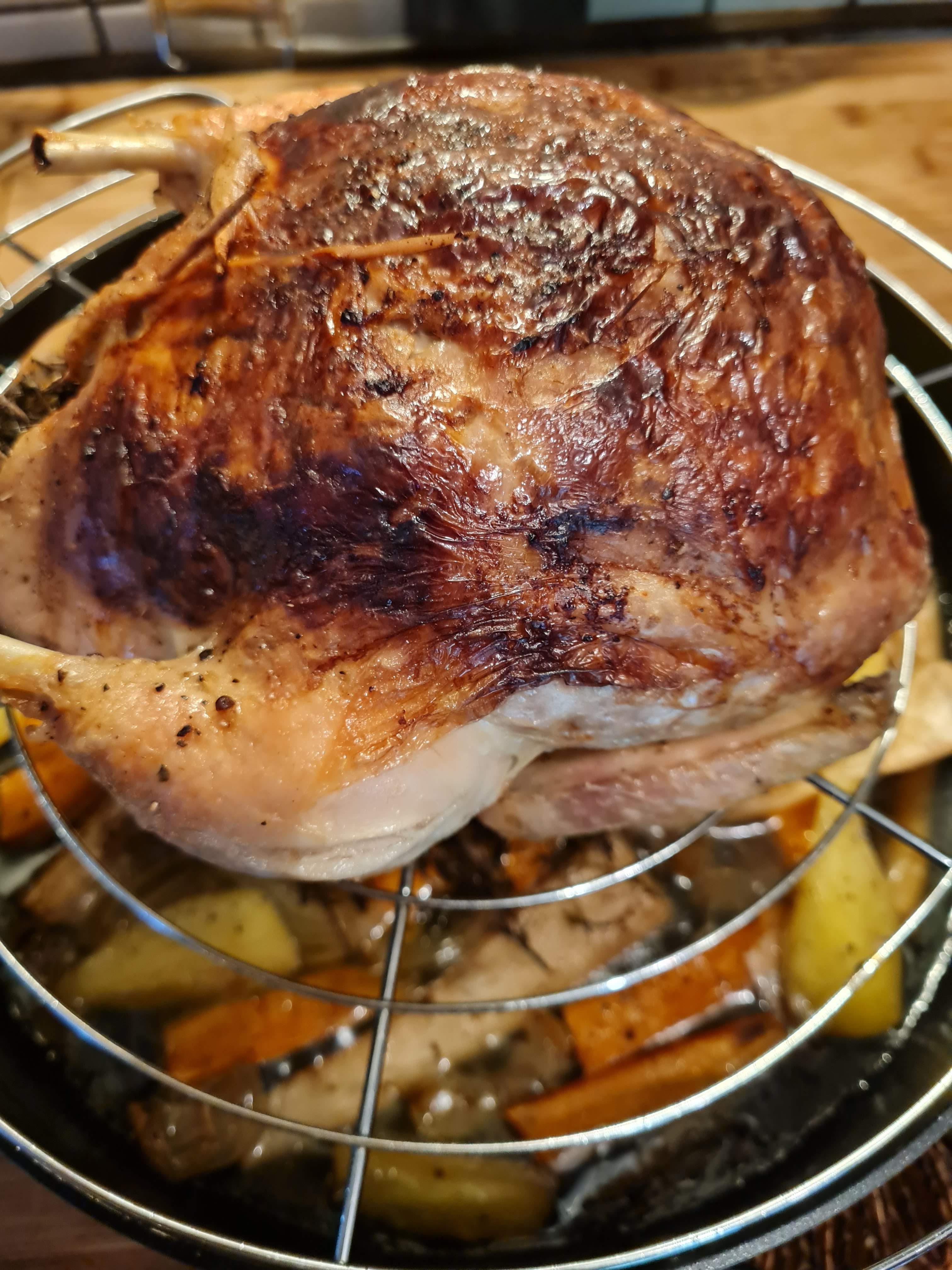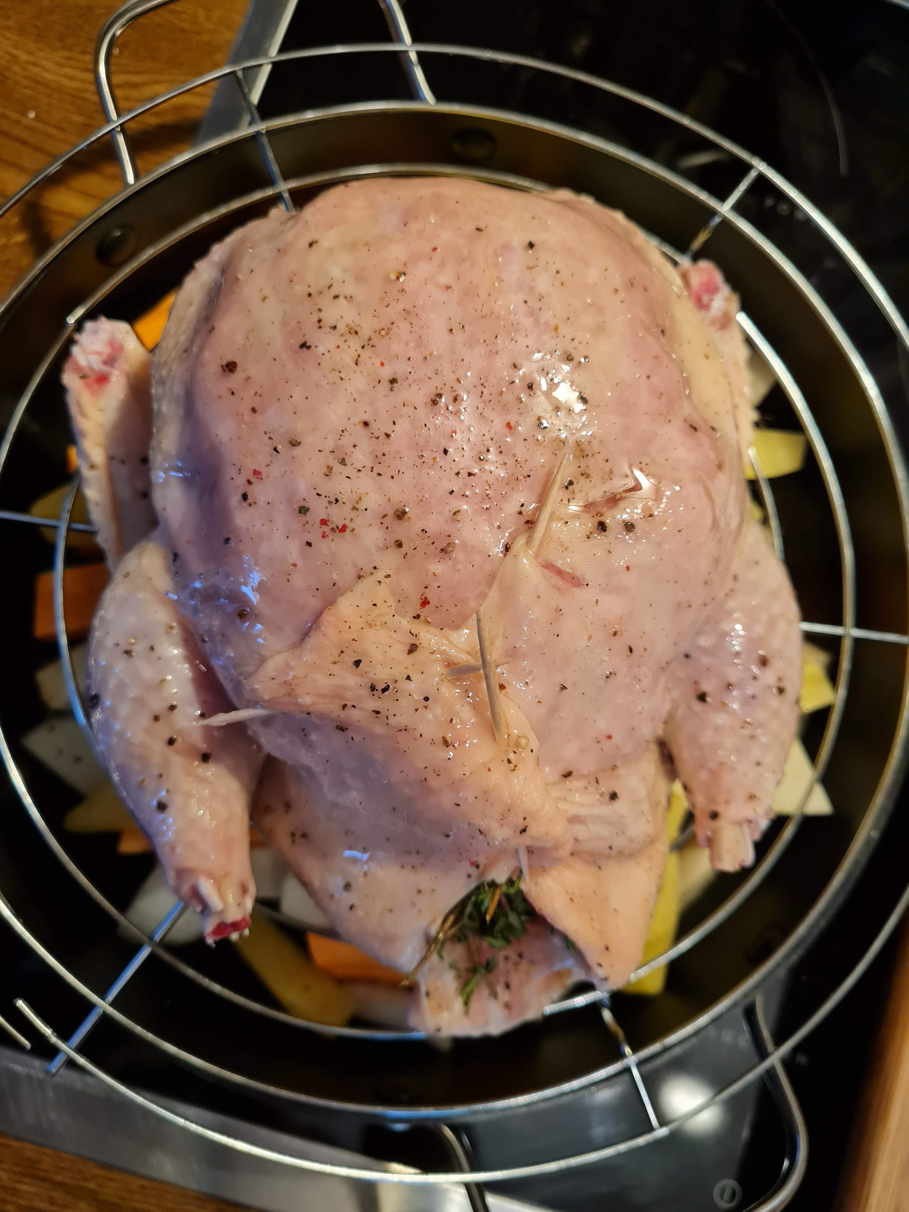 Върху тавичката със зеленчуци поставям решетка, а върху нея пилето.