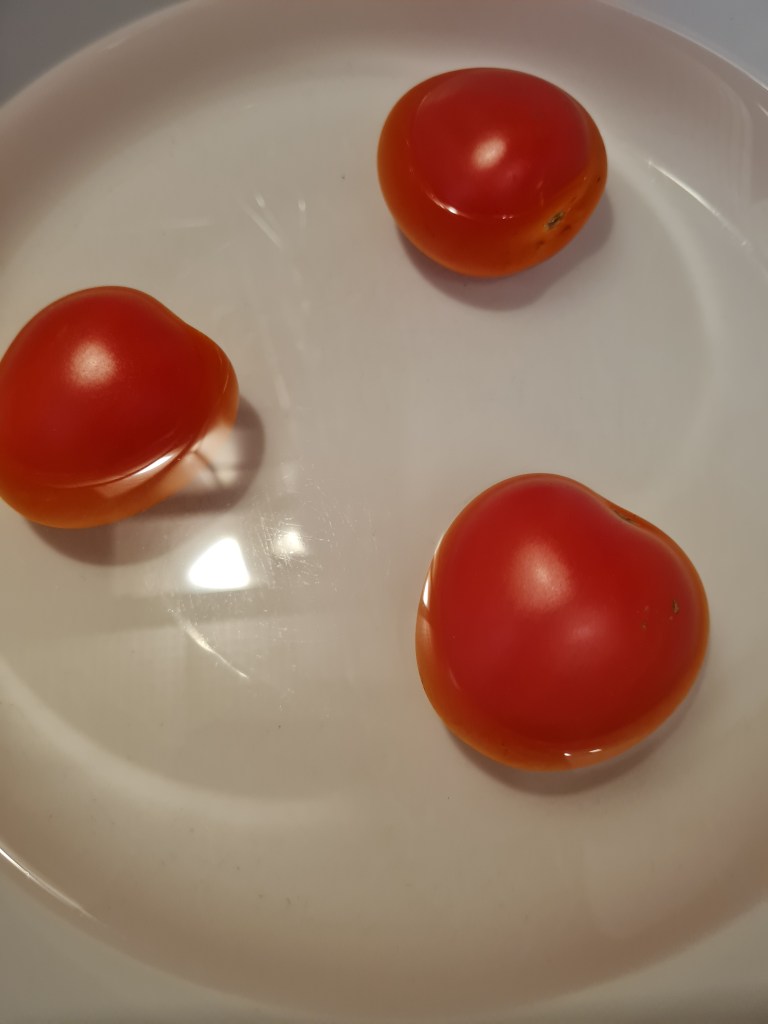 Доматите слагам в купа и заливам с вряла вода от бързоварната кана. Изчаквам 5 минути и обелвам.
