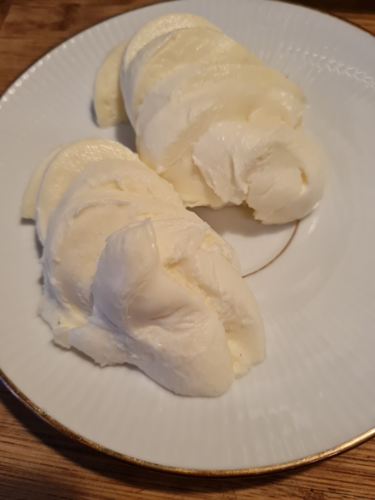 Моцарелата отцеждам от течността и нарязвам първо на половина и после на филийки.