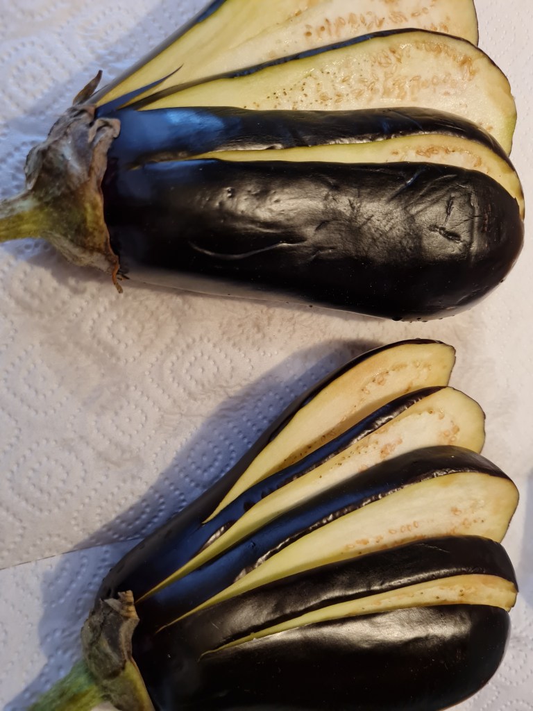 Започвам с подготовката на патладжаните. Във всяко ястие с тях пиша, че е нужно да престоят известно време със сол, за да им се отдели горчилката.