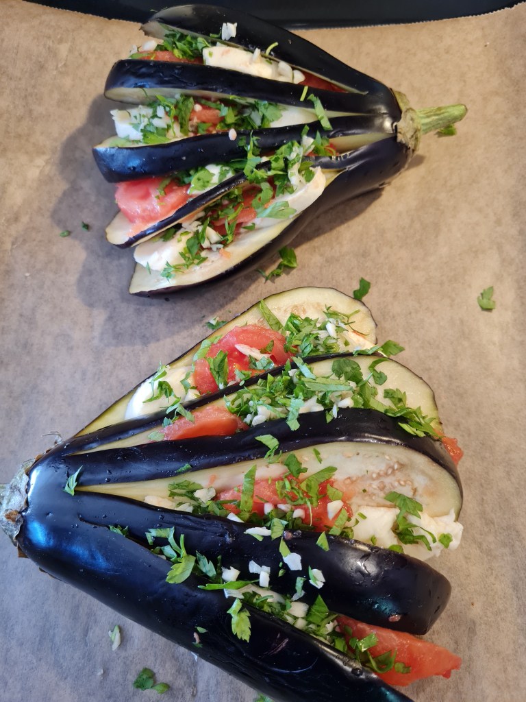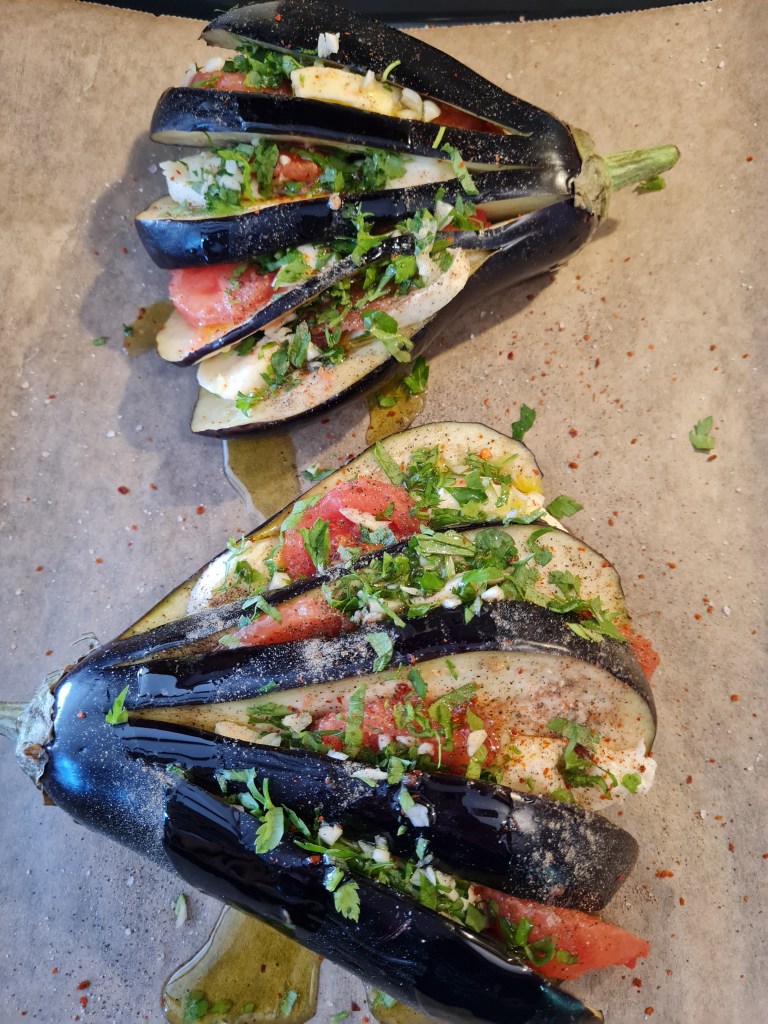 Слагам патладжаните в тава с хартия за печене и много внимателно, и редувайки подреждам поравно от доматите и моцарелата, като поръсвам между тях и с чесънче, и магданоз.