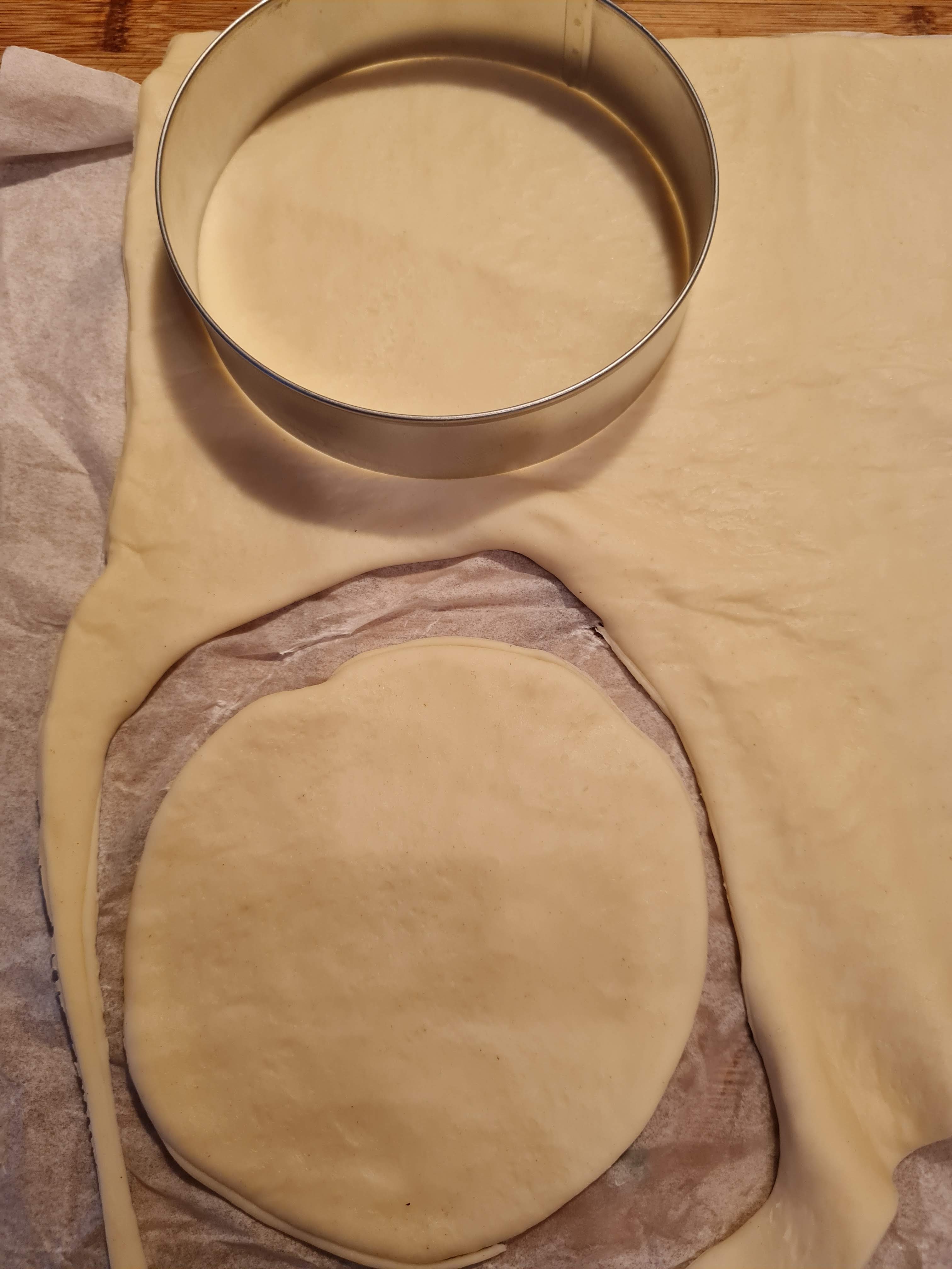 Готовото тесто е една кора с дебелина около 5 мм. Домашното тесто също трябва да се разточи на кора с дебелина около 5 мм.