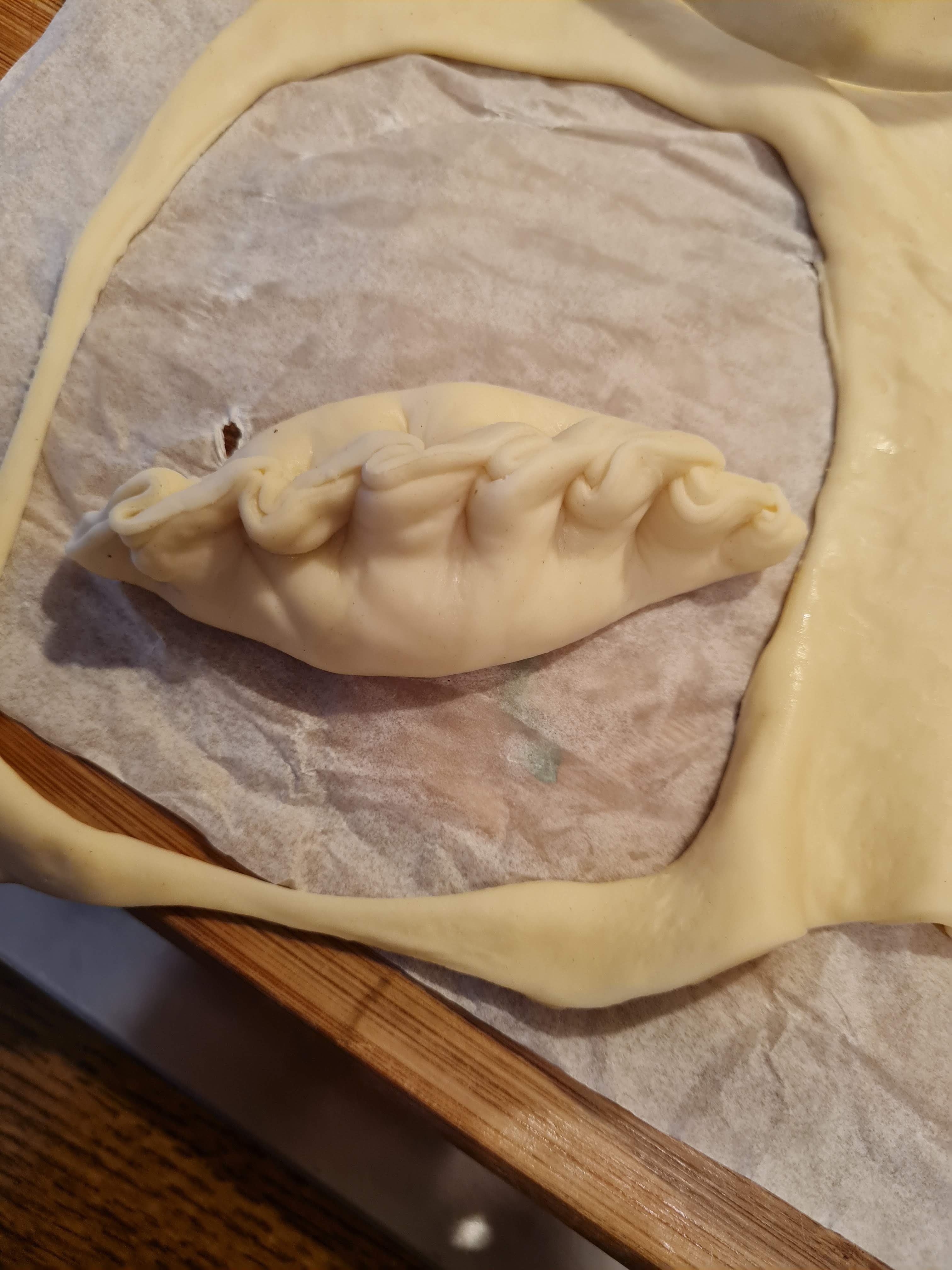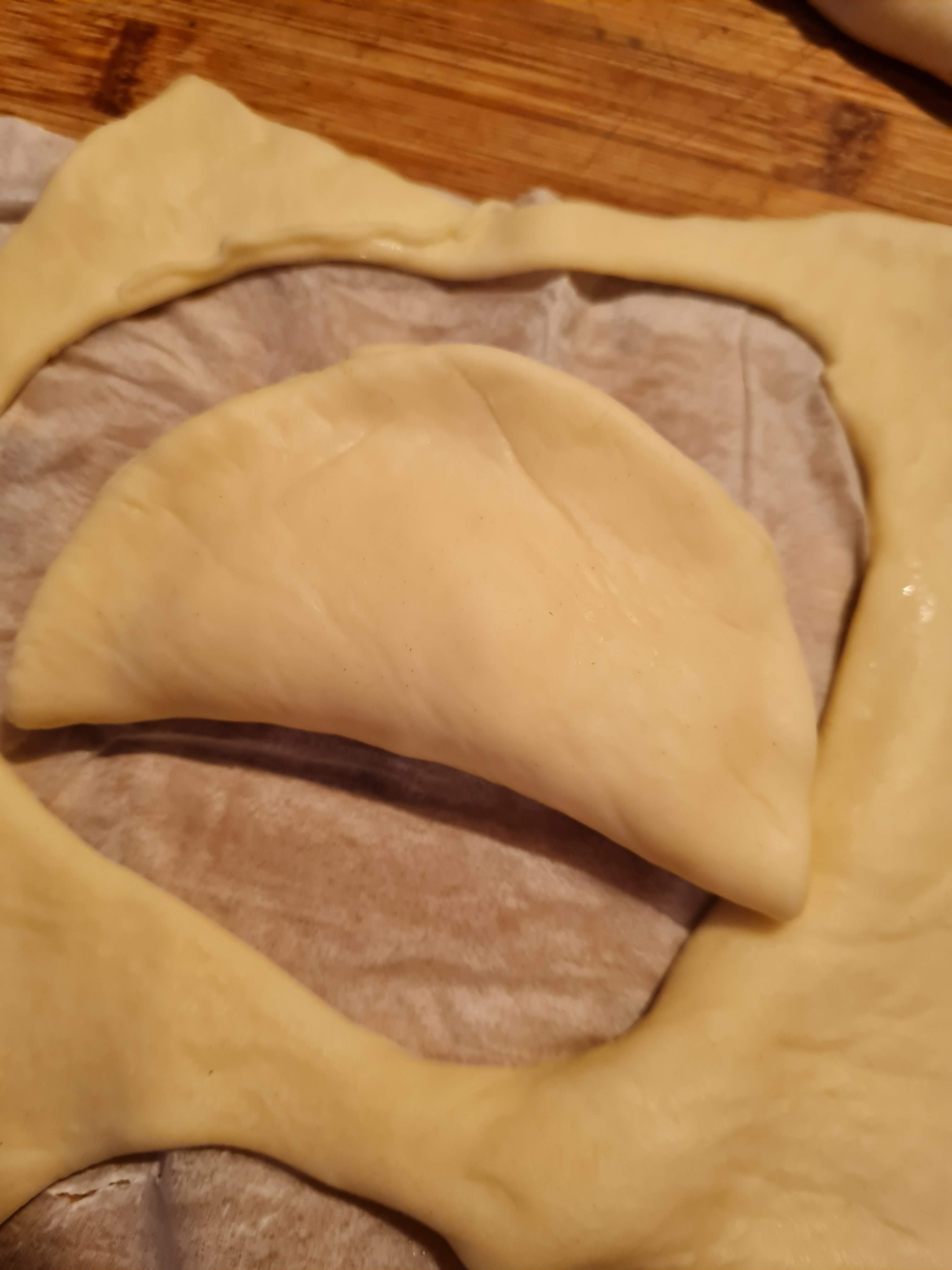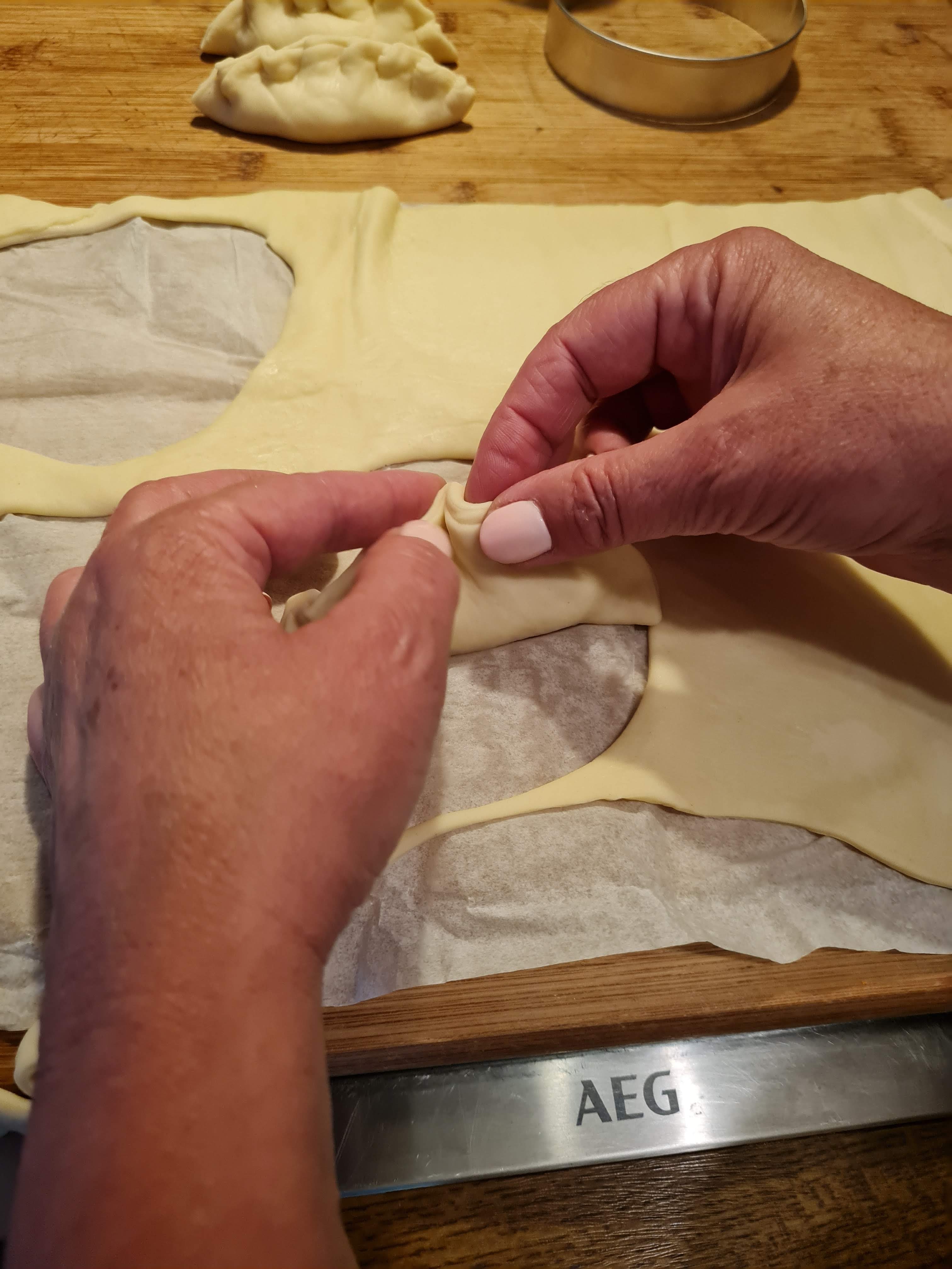 Захлупвам плънката с половината от тестото и леко притискам при намокрения край.