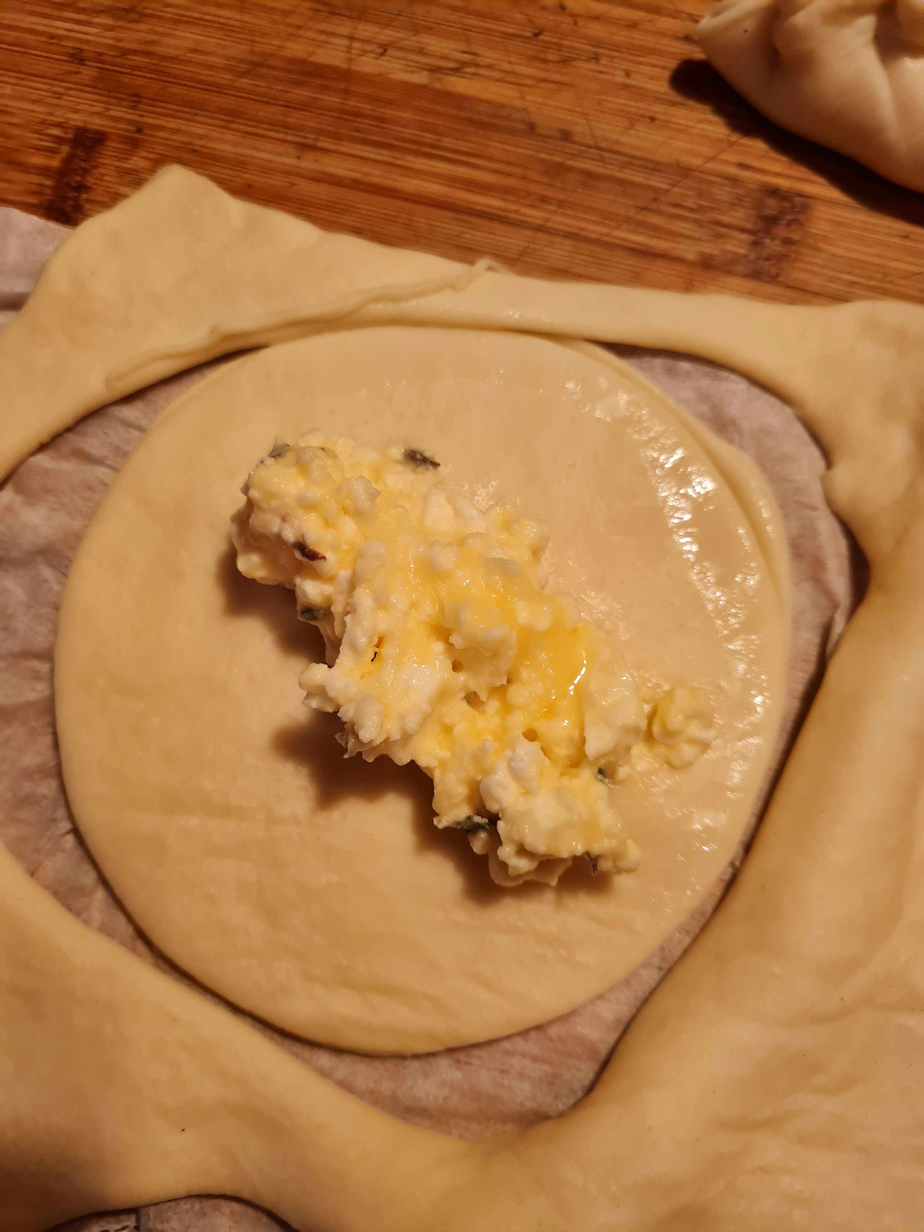 В средата на всяко кръгче от тесто слагам малко от плънката.