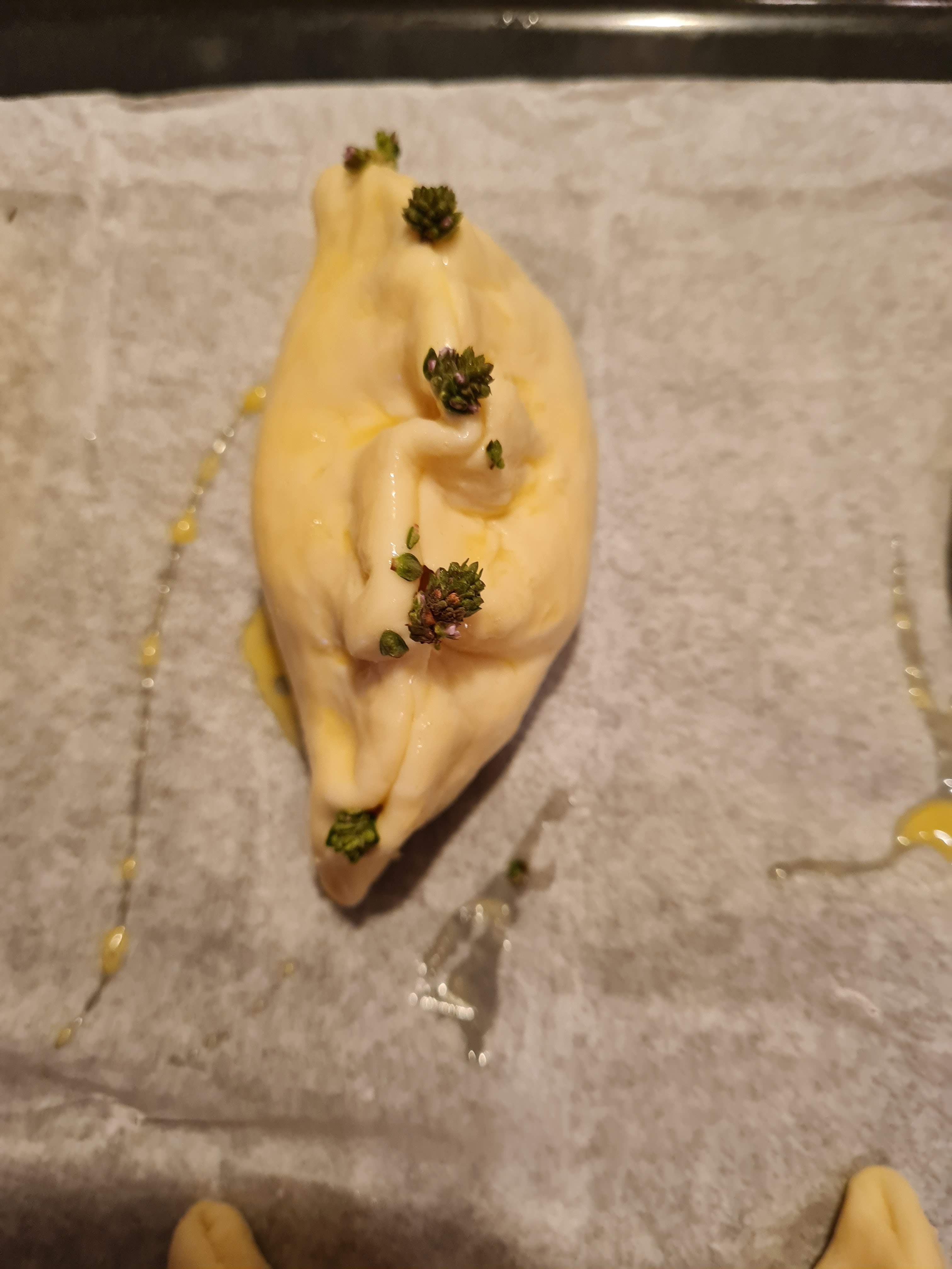 Намазвам с разбитото второ яйце и декорирам с цветовете (моята беше цъфнала) на прясната мащерка. Или просто поръсвам със сусам, ако нямам мащерка.