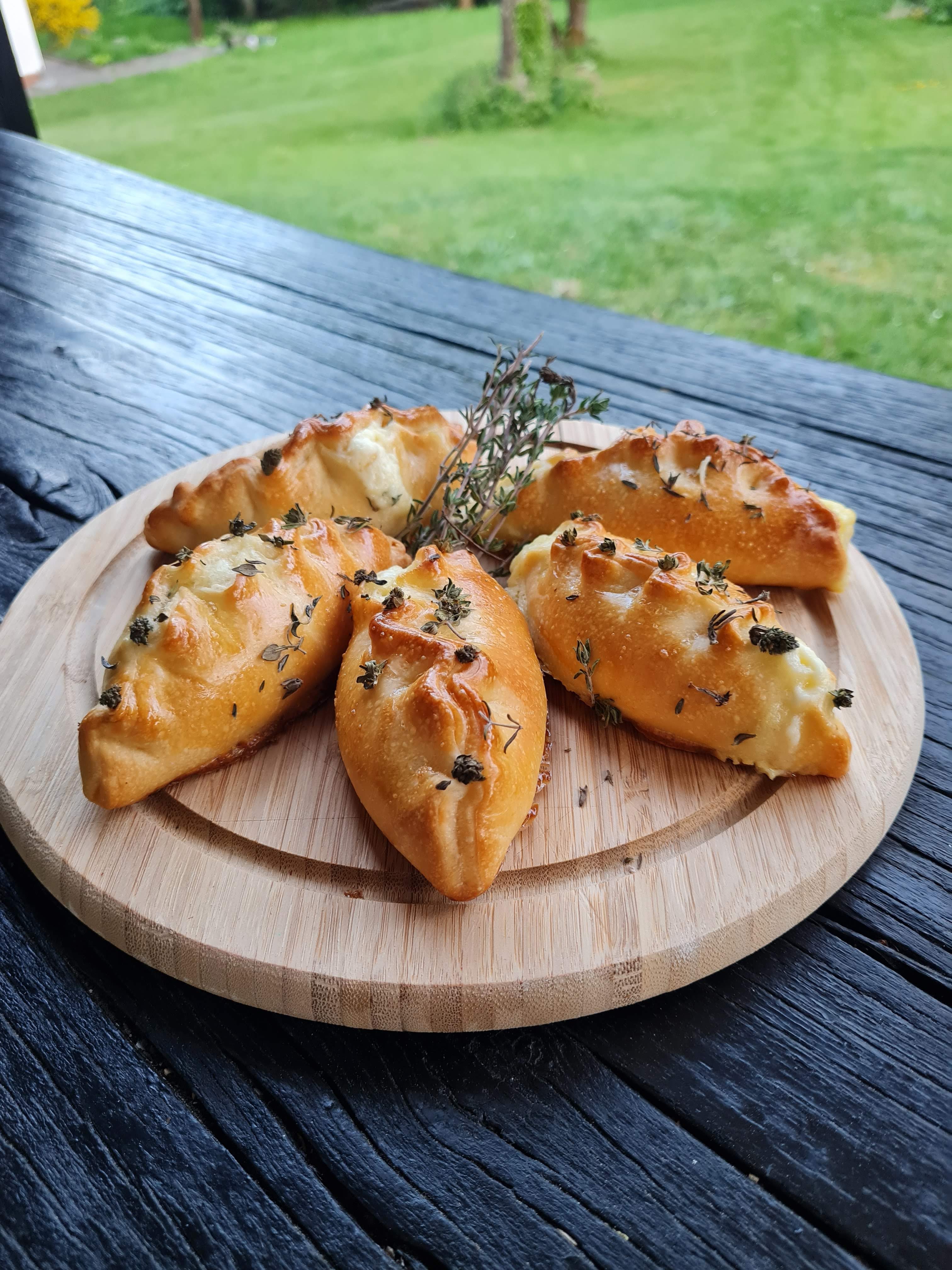 От едното яйце и сиренето приготвям плънката, като подправям с част от листенцата на прясната мащерка.