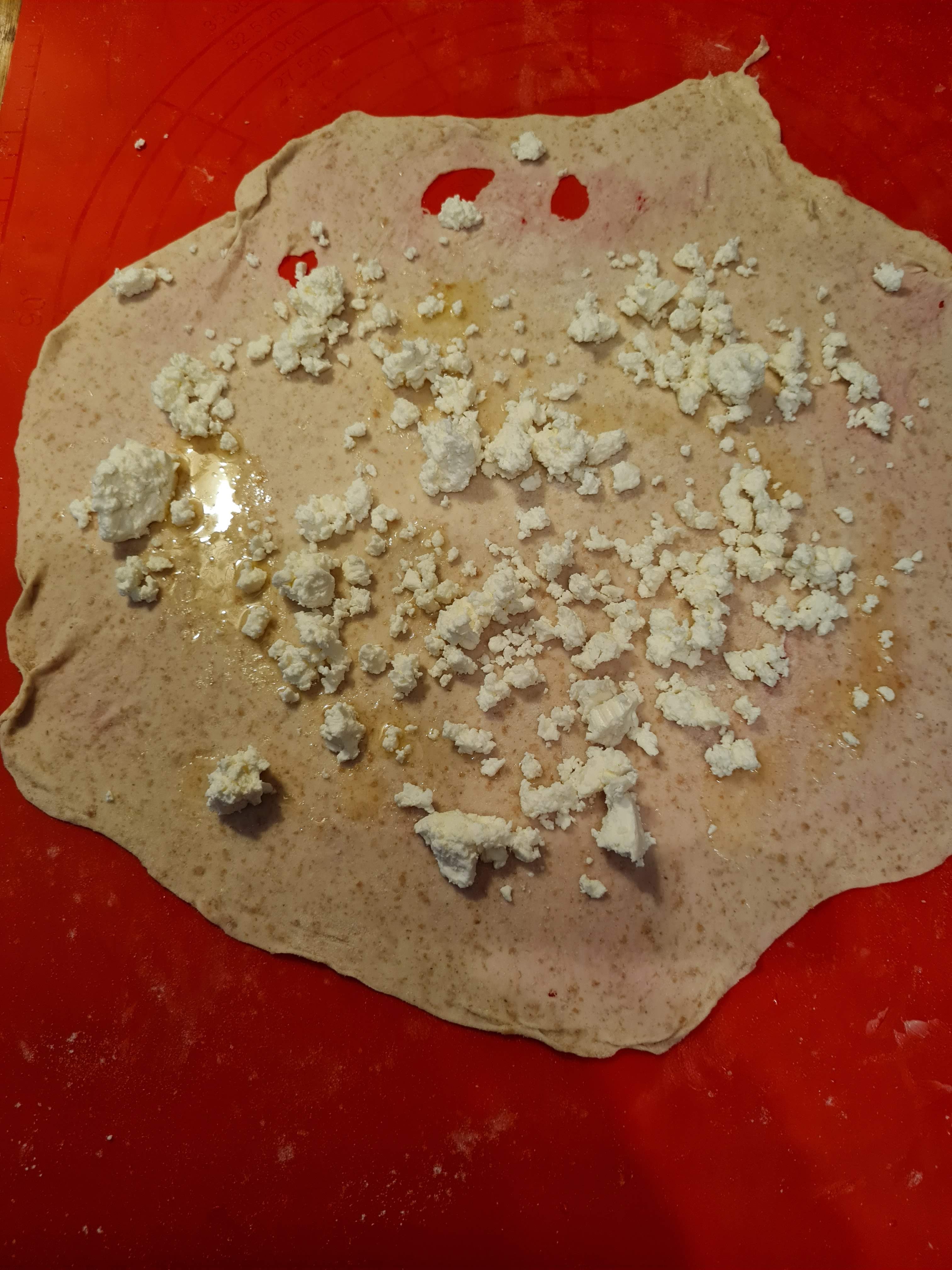 По средата на кората поръсвам с масло и с натрошено сирене.