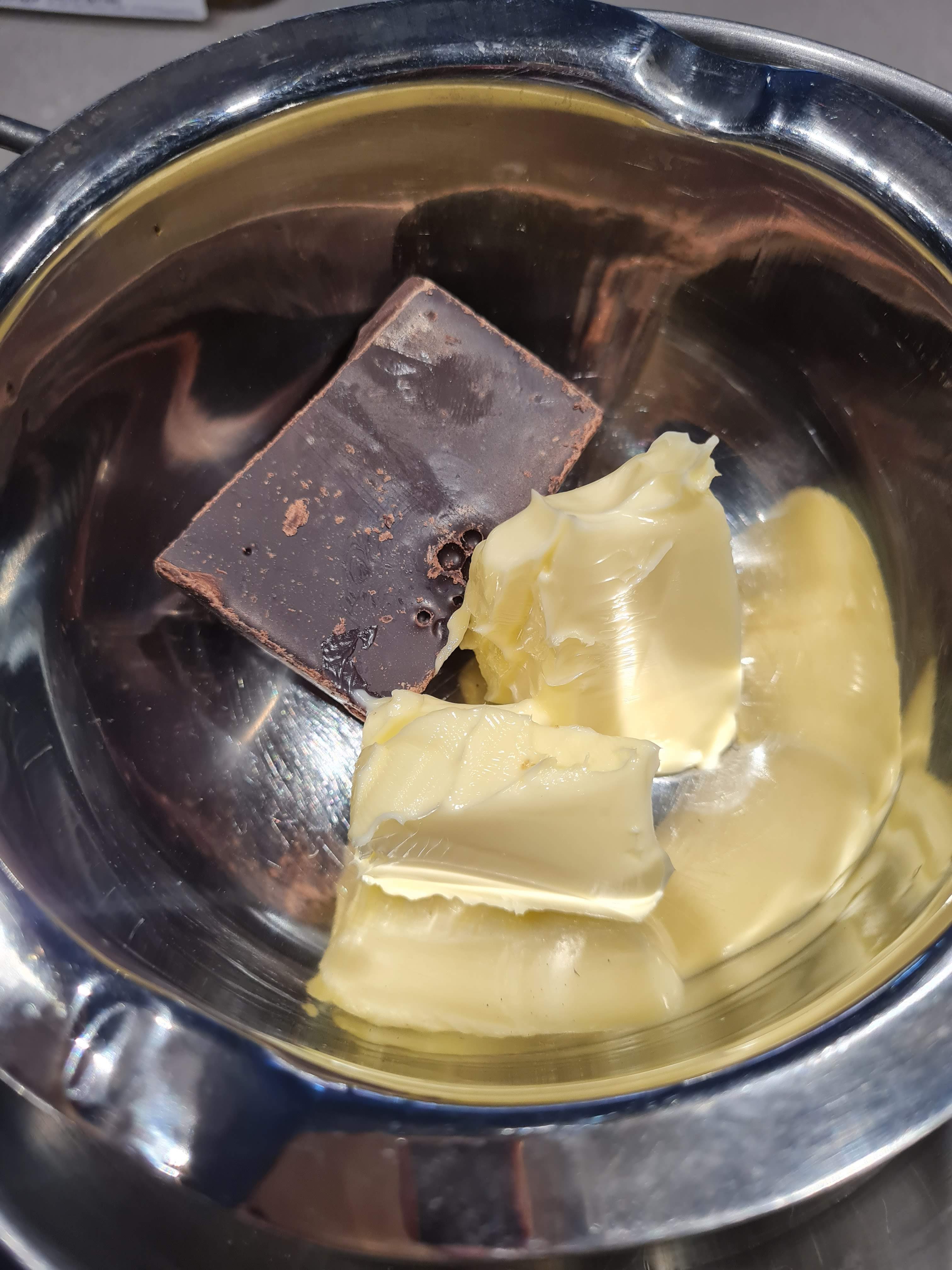 В касерола отмервам маслото и шоколада и ги разтопявам на водна баня.
