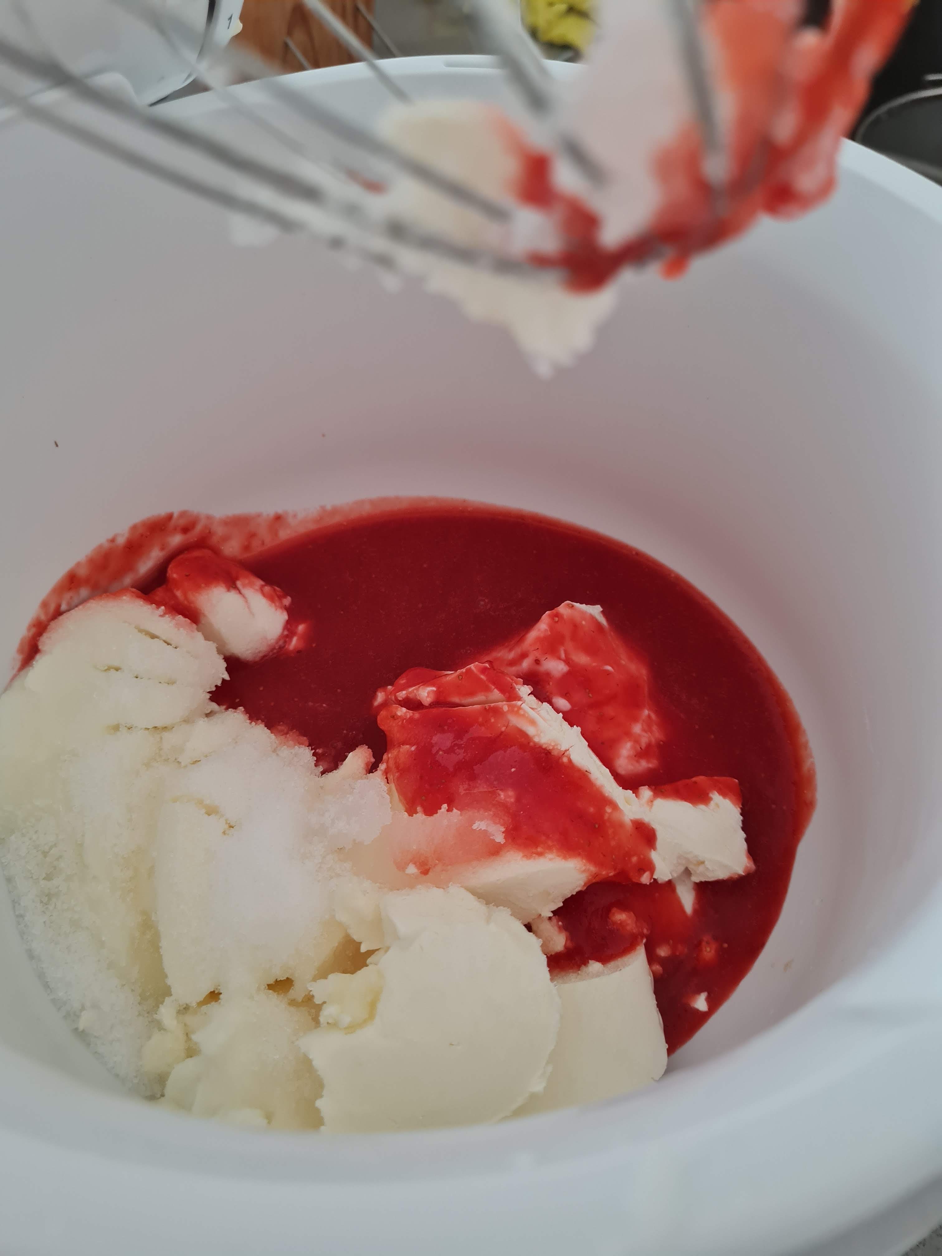 Маскарпонето, захарта, изварата, лимоновия сок и ягодовото пюре разбивам с миксера.