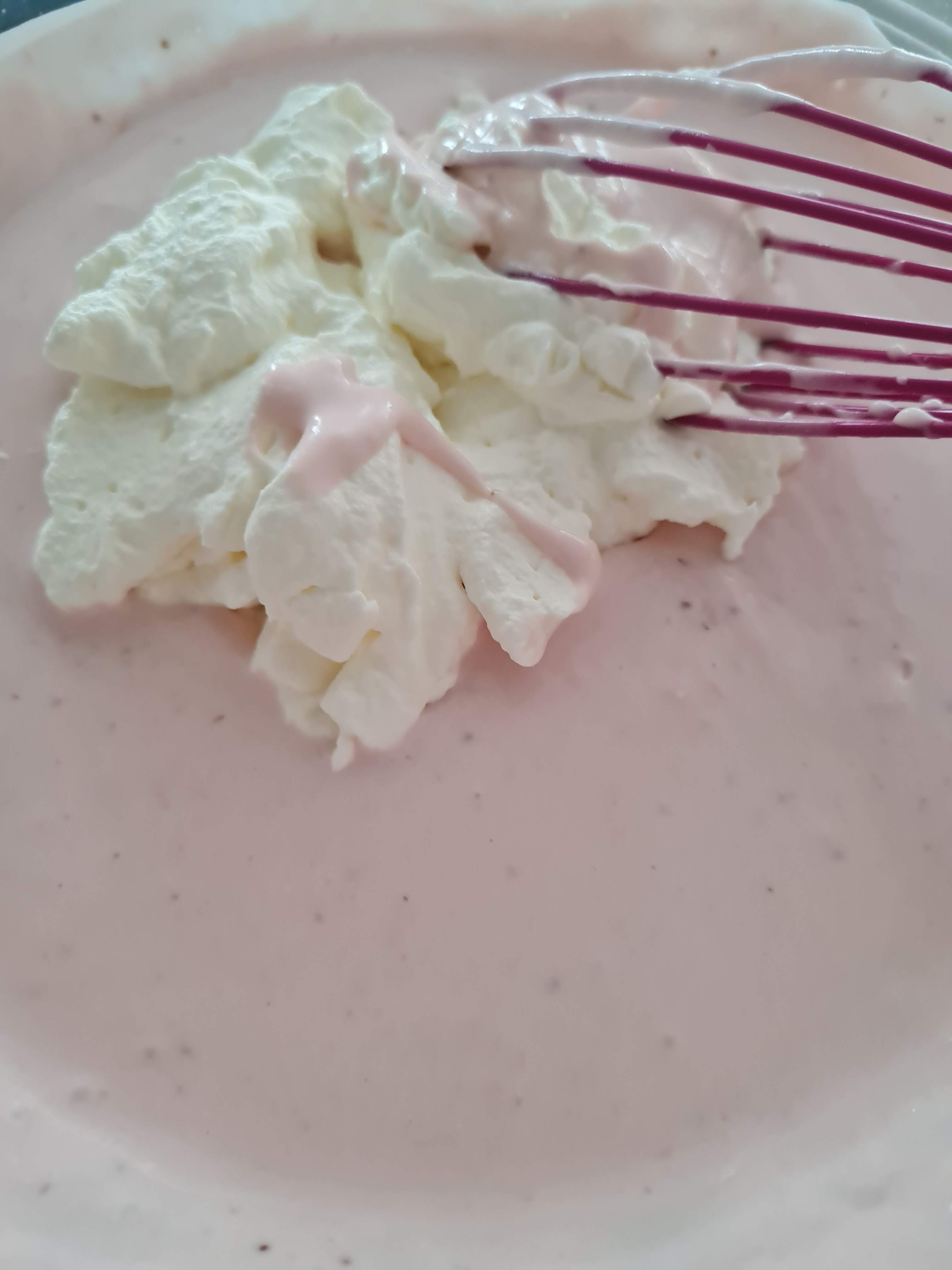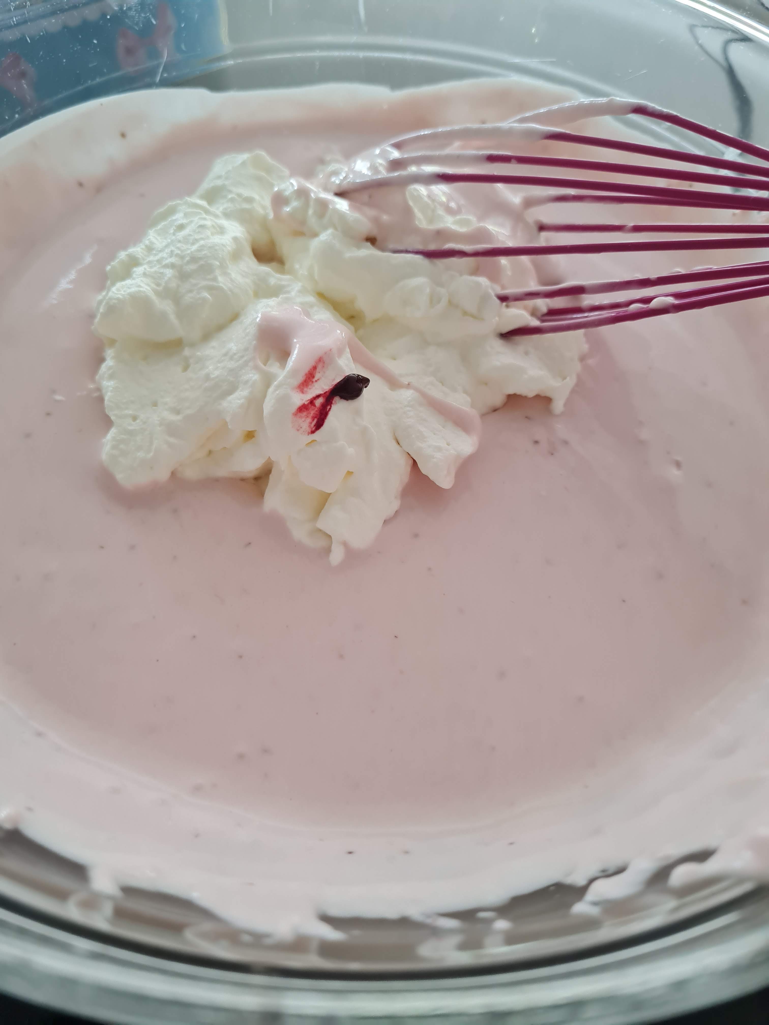 Цветът на муса ми се видя много бледо розов и добавих една капка сладкарска боя. Това направи крема по-ярко розов.