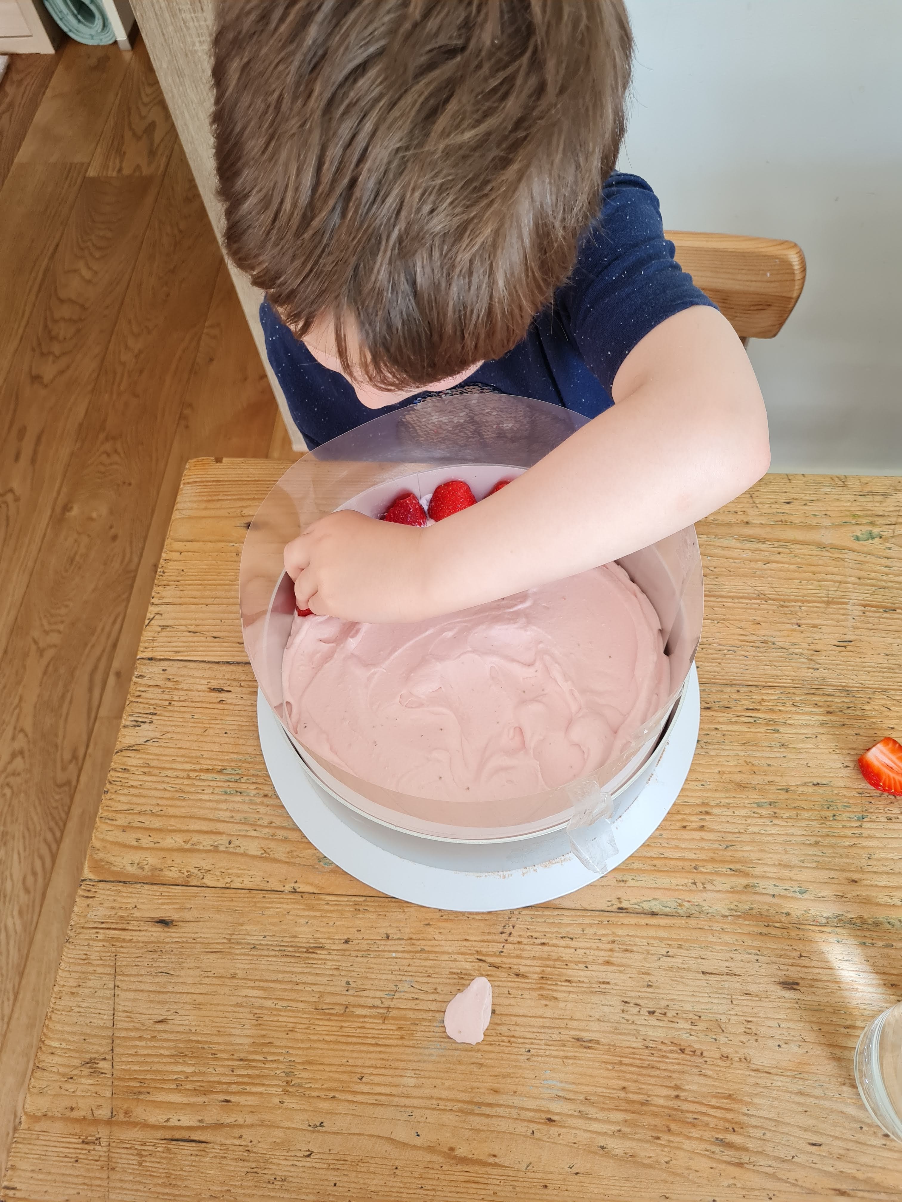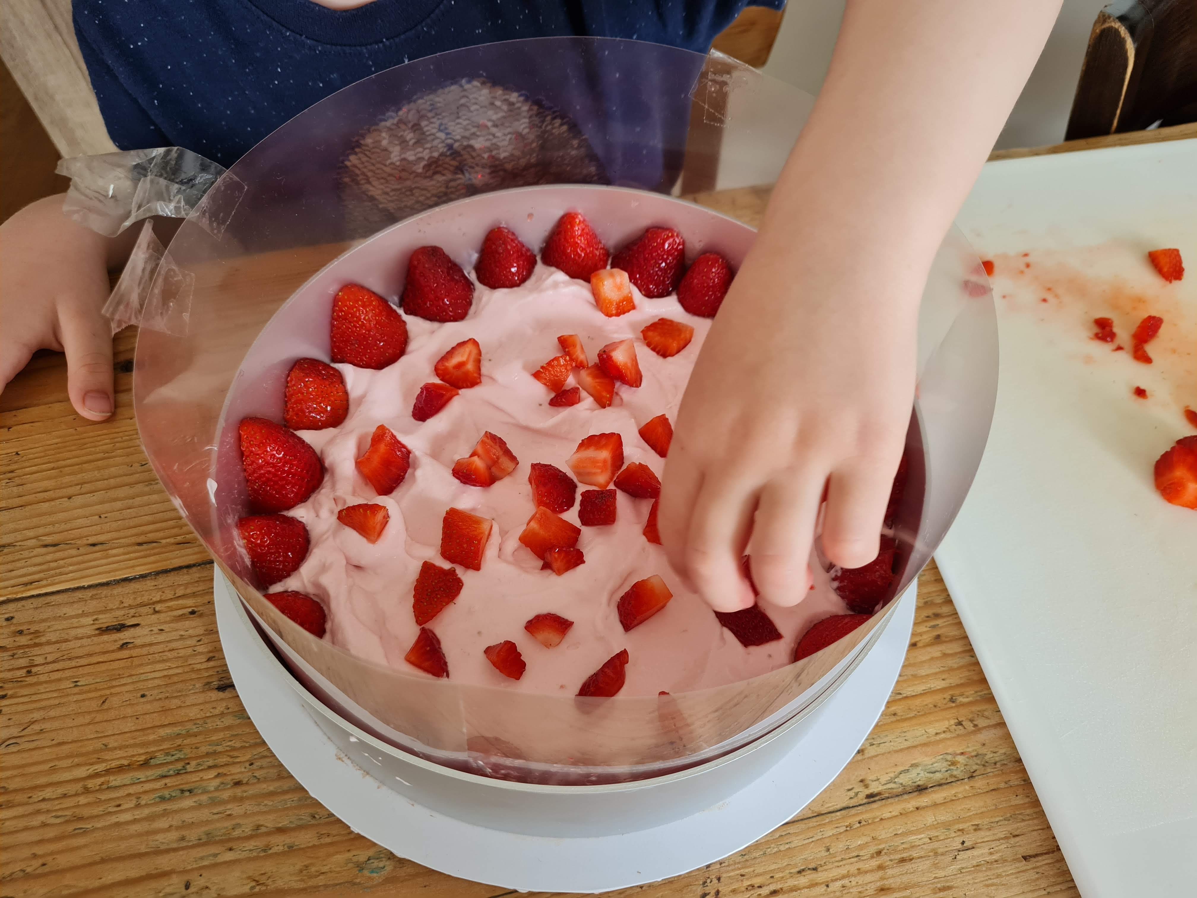 Изсипах 1/3 от муса върху охладения блат и дадох възможност на внука да декорира с измитите ягоди и разрязани от мен на половина по дължина.