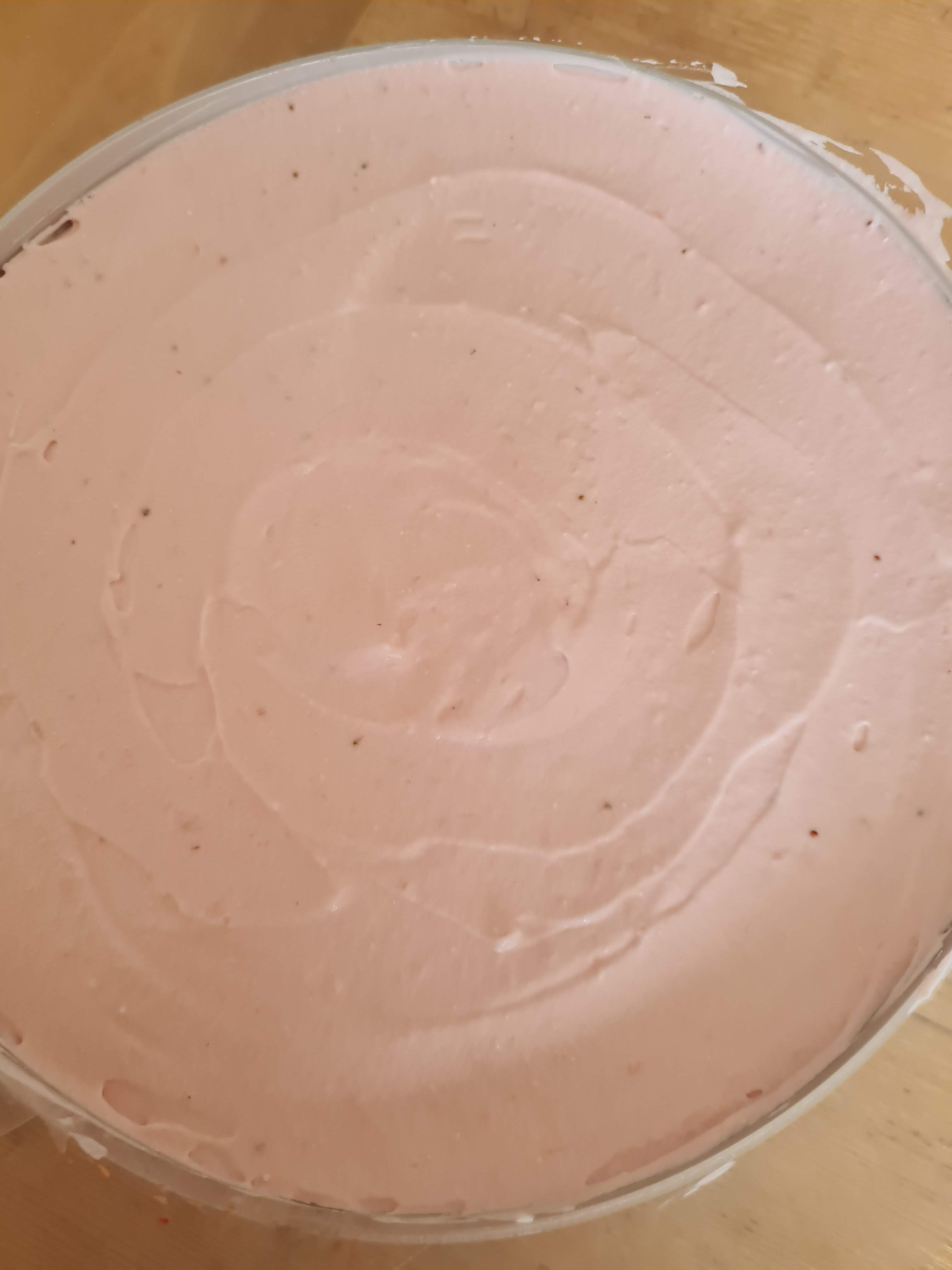 Към разтворения желатин добавям няколко лъжици от ягодовия крем, за да уравновеся температурите им и после изсипвам на тънка струя обратно в крема. Не спирам да разбърквам. Така не се получава шоково стягане на желатина.
