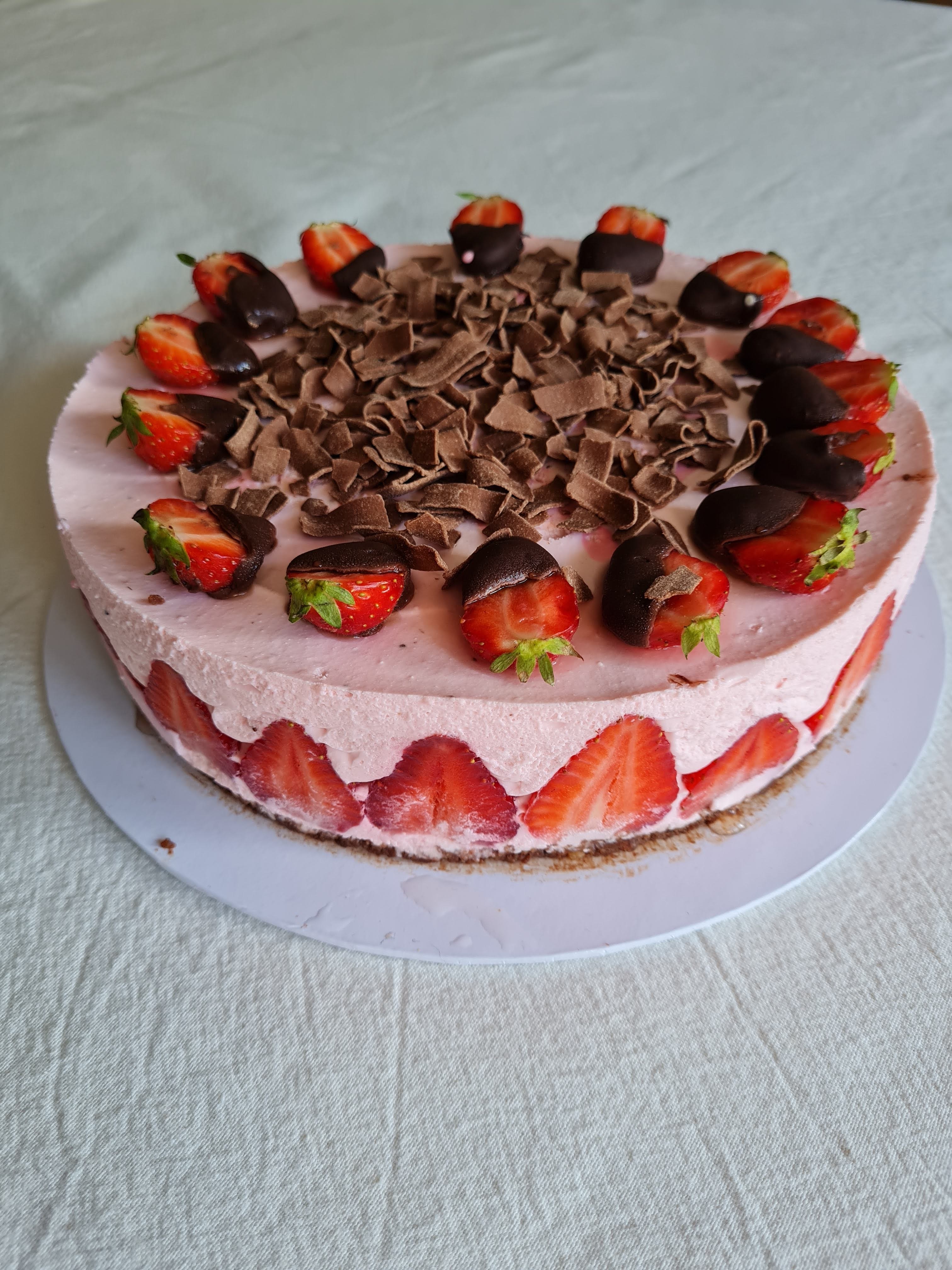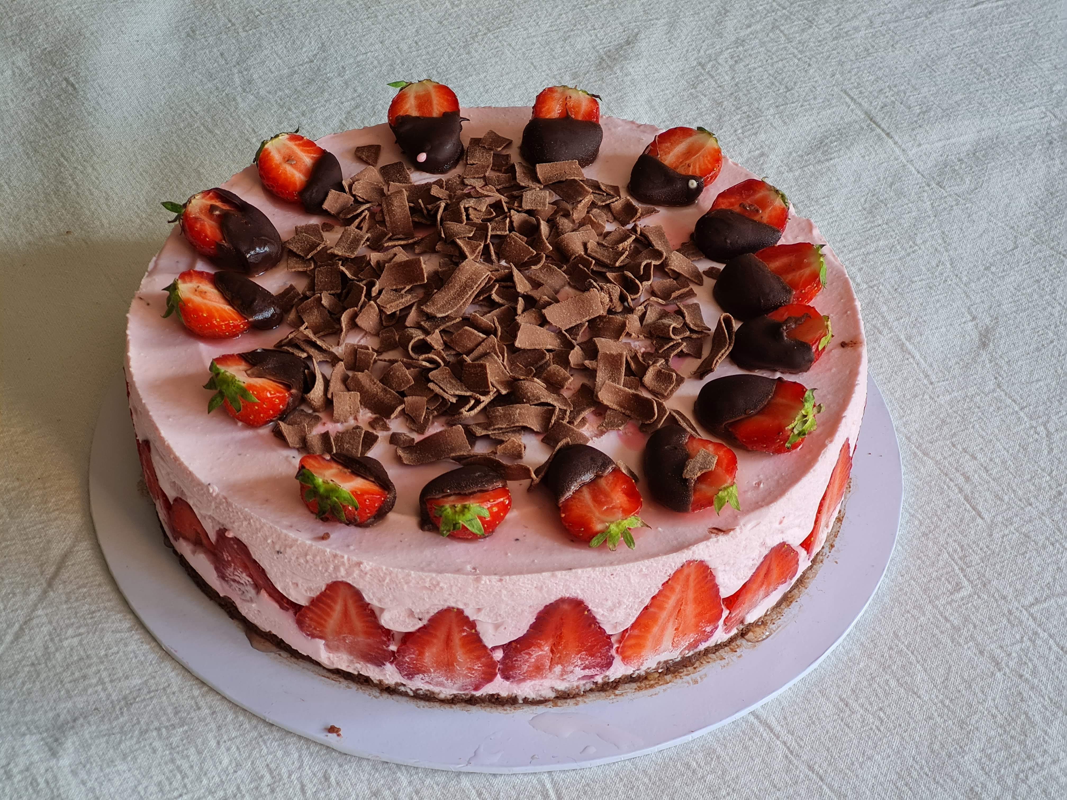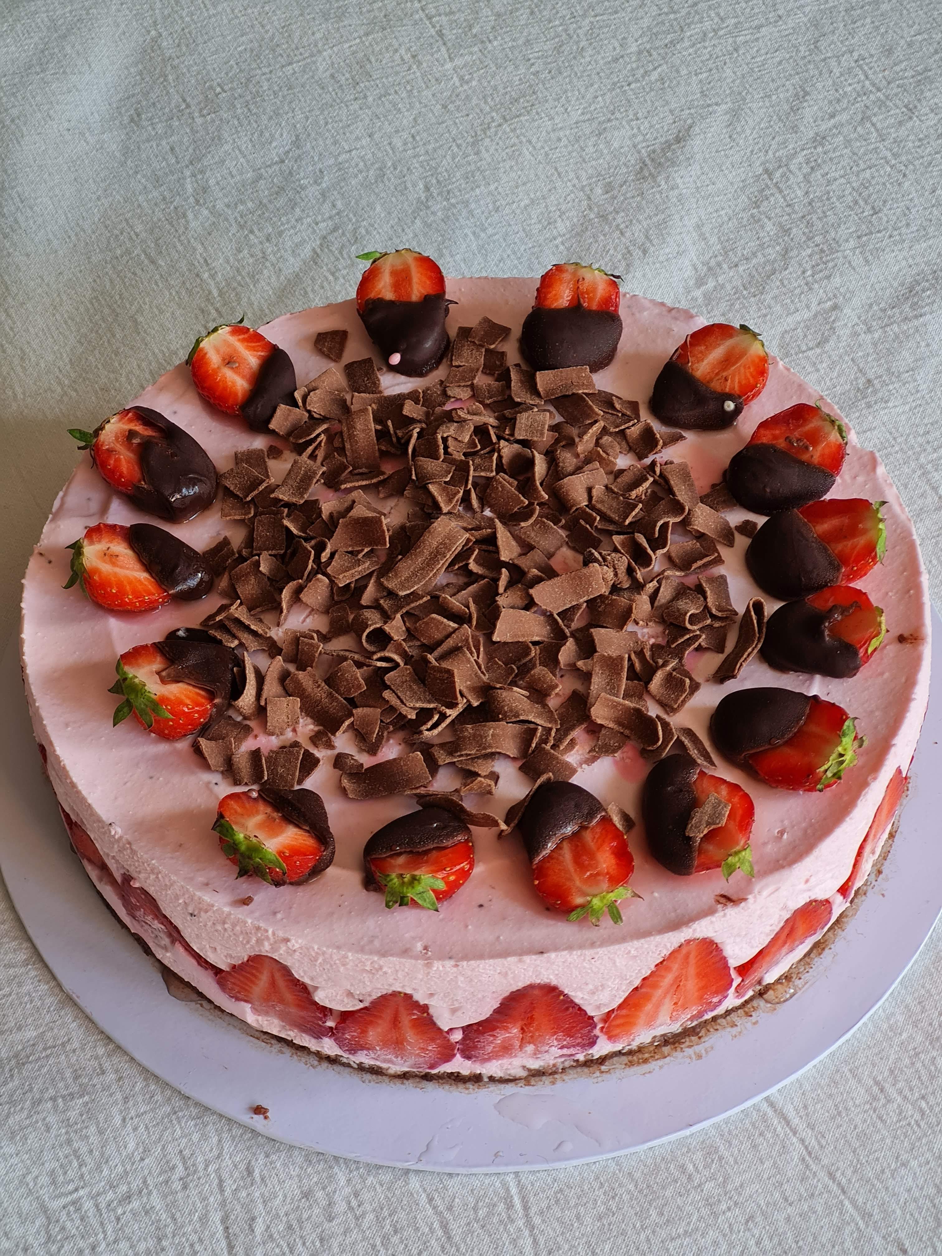 На другия ден разтопявам шоколад на водна бана, топя отрязани на половина ягоди, но с листенцата и веднага слагам върху тортата. По средата поръсвам с шоколадови парченца. В случая холандски и големи.