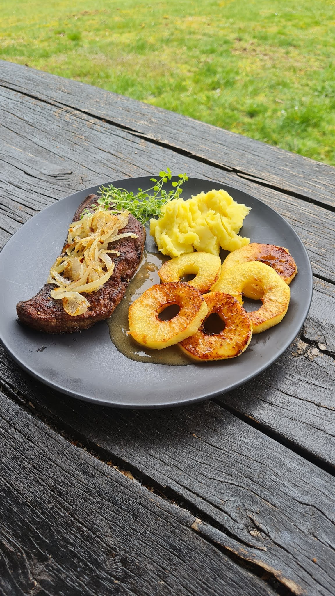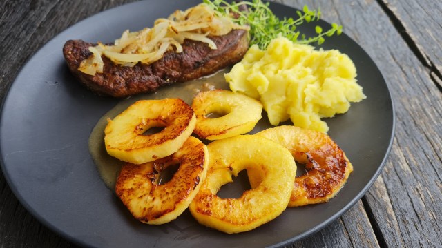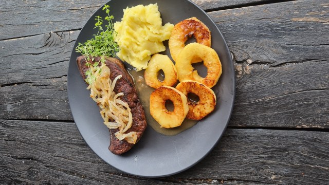 Нищо особено! Пържен телешки или свински дроб, пържени ябълки, сос, хрупкав пържен лук /рецепта тук/ и за гарнитура – картофено пюре. Много просто, но важното е да се сети човек. Е …. аз не се сетих, а за първи път опитах този телешки дроб, когато работех в един друг немски ресторант. Тогава още не говорех добре езика и бях помощник в кухнята. Всъщност от собственика и готвач в този ресторант – Оли, бивш волейболист, научих и рецептата. Останах много очарована от вкуса и веднага възпроизведох рецептата у нас. Хареса се и така влезе в моето тефтерче. Препоръчвам Ви и Вие да опитате!