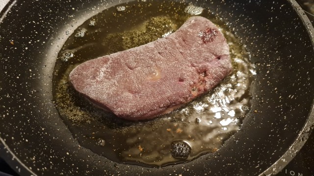 - Обръщам и пържа още около 3 мин. Чак сега посолявам и добавям черен пипер. Пърженето е в голямо количество мазнина, защото така дробът се изпържва добре и в сърцевината. Тъй като не обичам да е много сух, оставям го леко алангле. Проверявам готовността на дроба като стек – натискам с пръст, ако пръстът ми потъва – още не е готов. Ако при притискането усещам стегнатост на дроба – готов е. Но в никакъв случай не препържвам дроба, защото става жилав и сух.