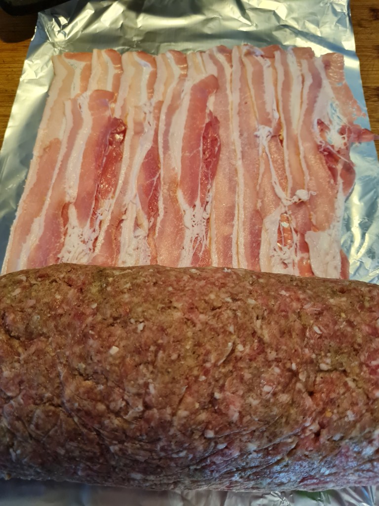 На друго фолио подреждам тънките, почти прозрачни филийки бекон. Тук така се продават.