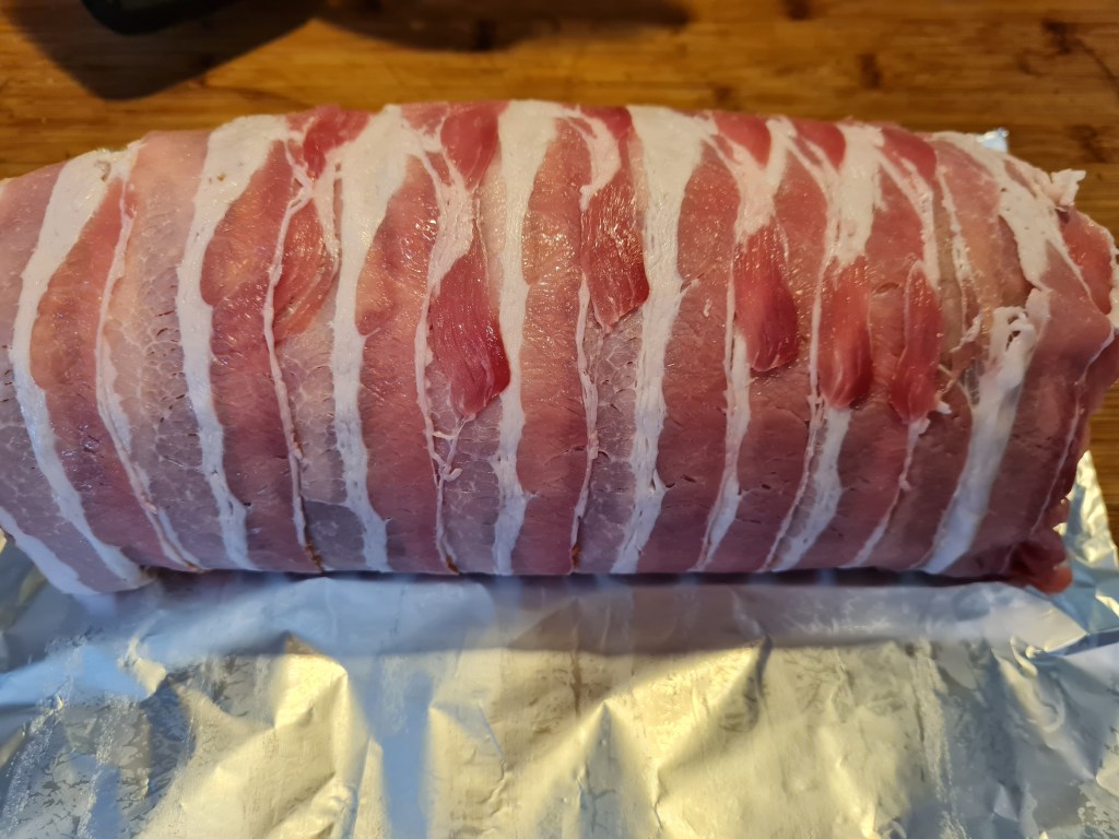 След това време увелечавам фурната до 230° и премахвам фолиото от рулото. Засичам отново 25 минути. Време напълно достатъчно да се запече и рулото, и беконът.