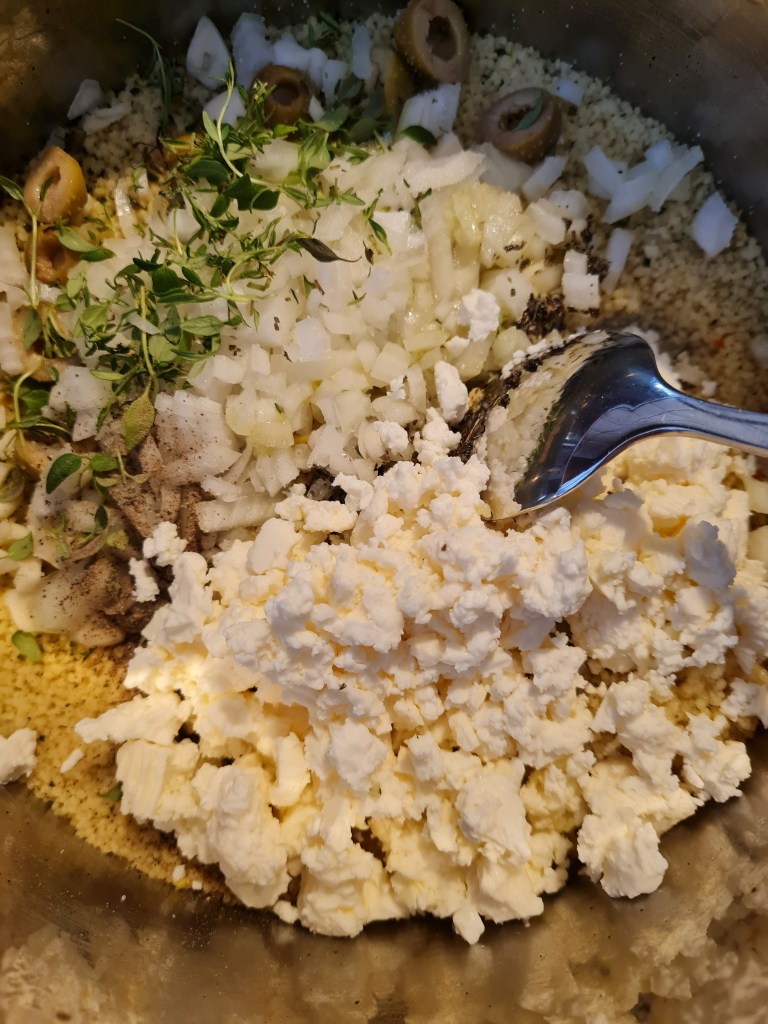Към набъбналия кускус добавям нарязания на ситно кромид лук, чесън, сухите подправки, зехтин, сол, пипер, натрошено сирене, нарязани маслини. Разбърквам.