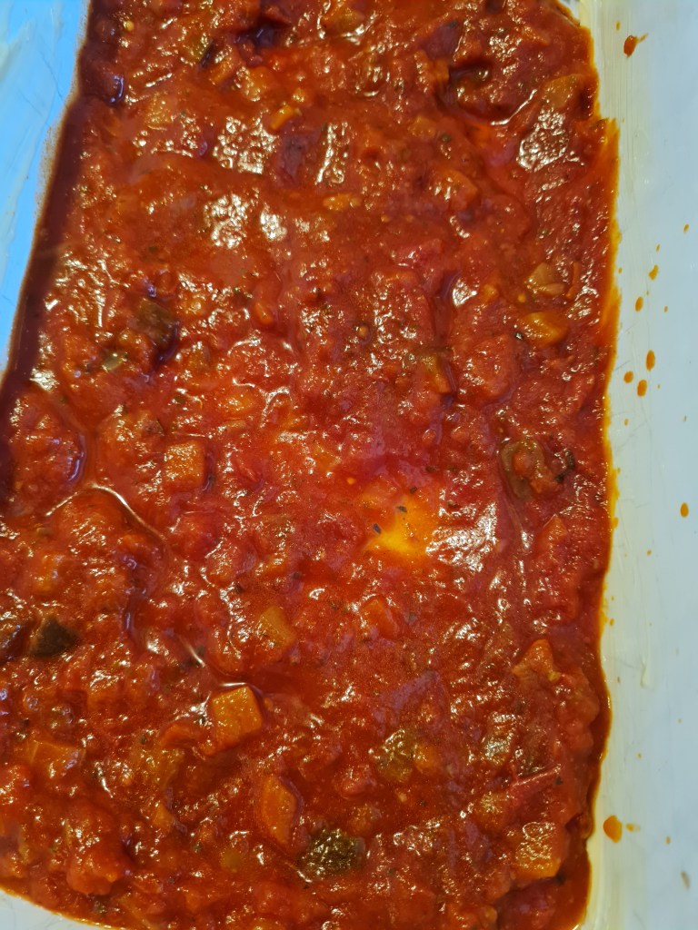 Намазвам тавичката с маргарин или мазнина по избор, изливам на дъното доматения сос.