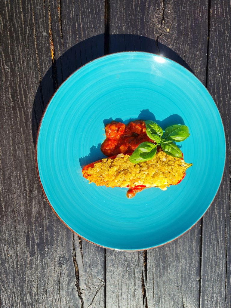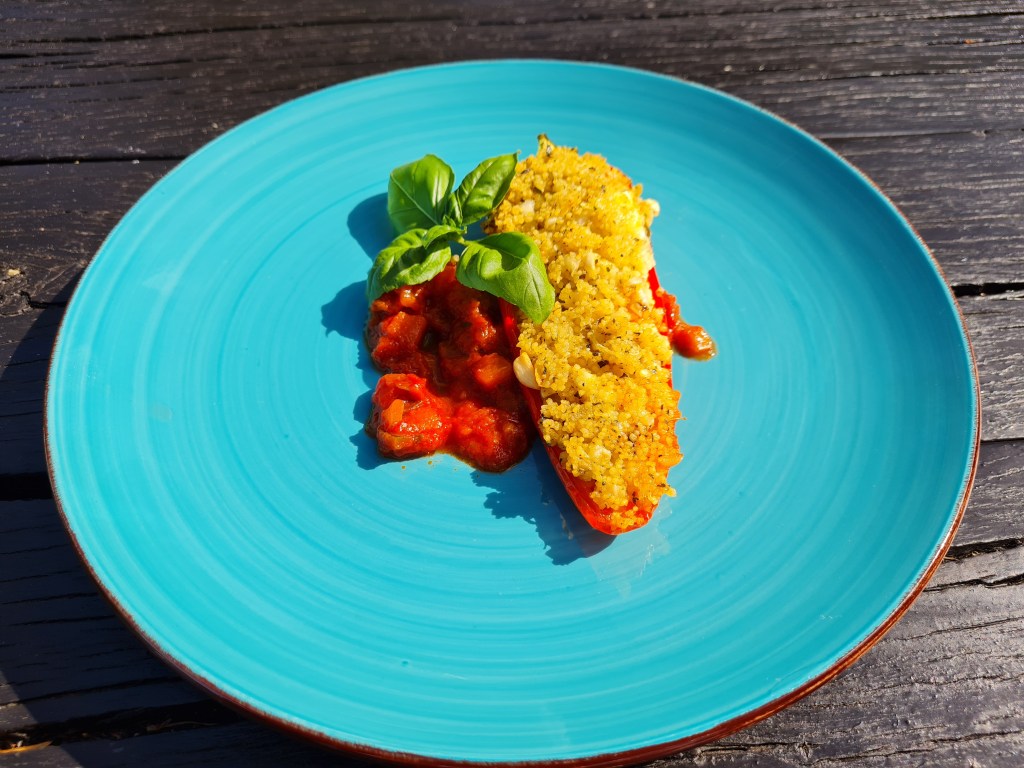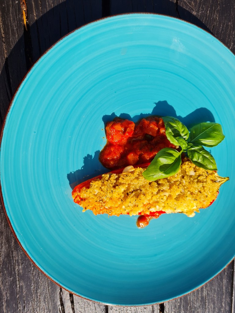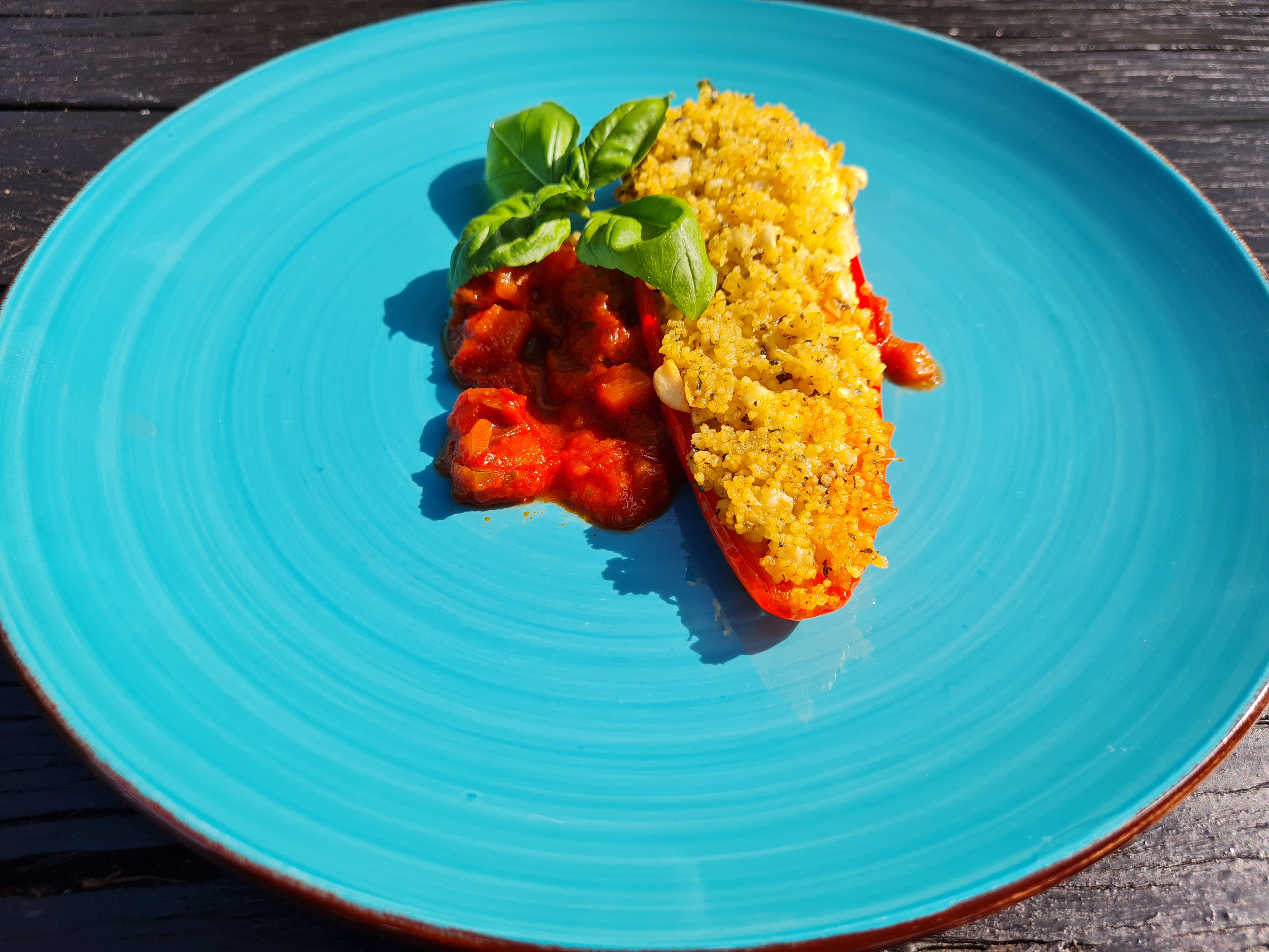 Напълвам чушките обилно с кускус и подреждам върху доматеното пюре.