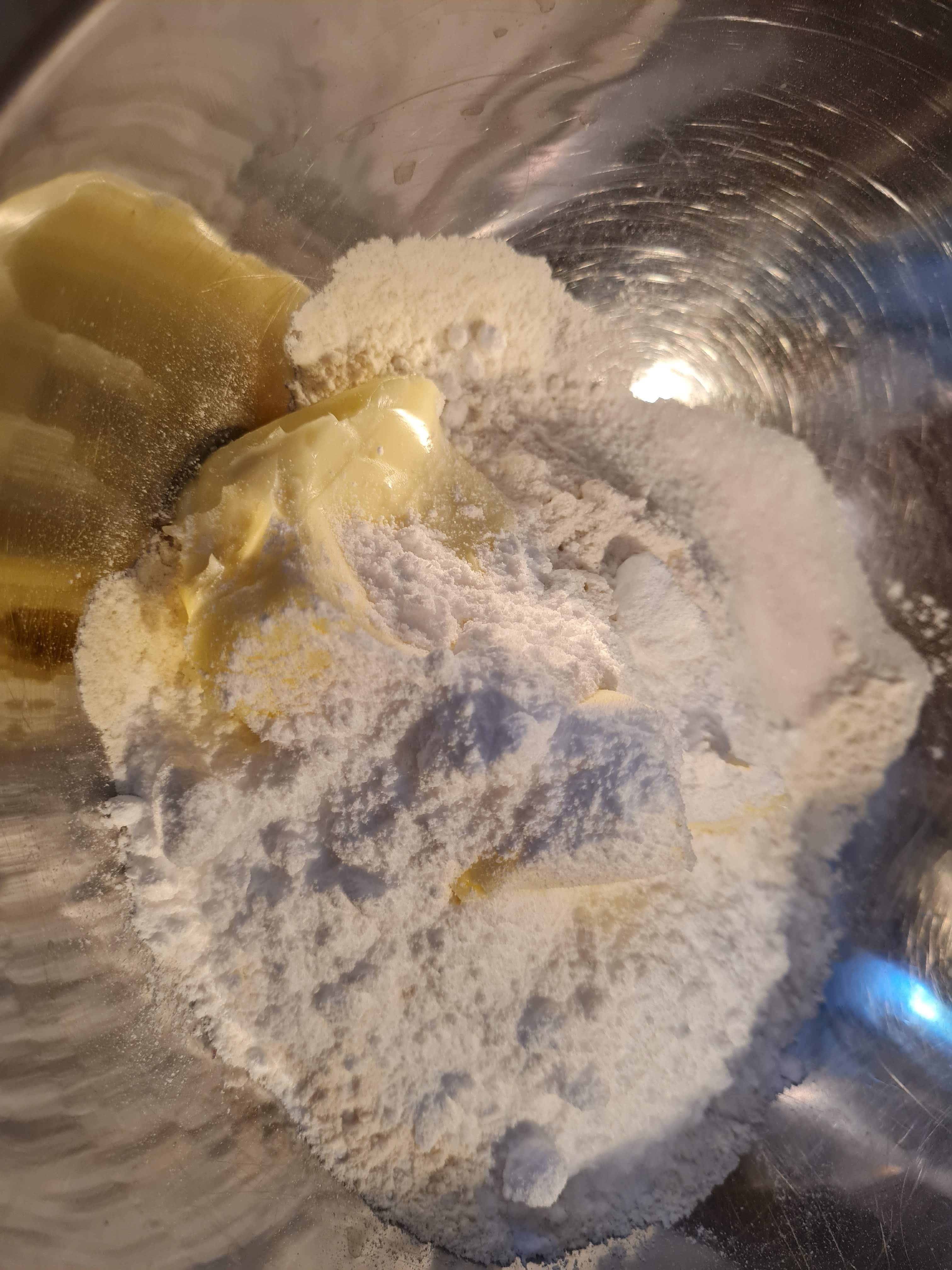 Купата с готовите трохи слагам в хладилник, докато подготвя тестото за сладкиша.