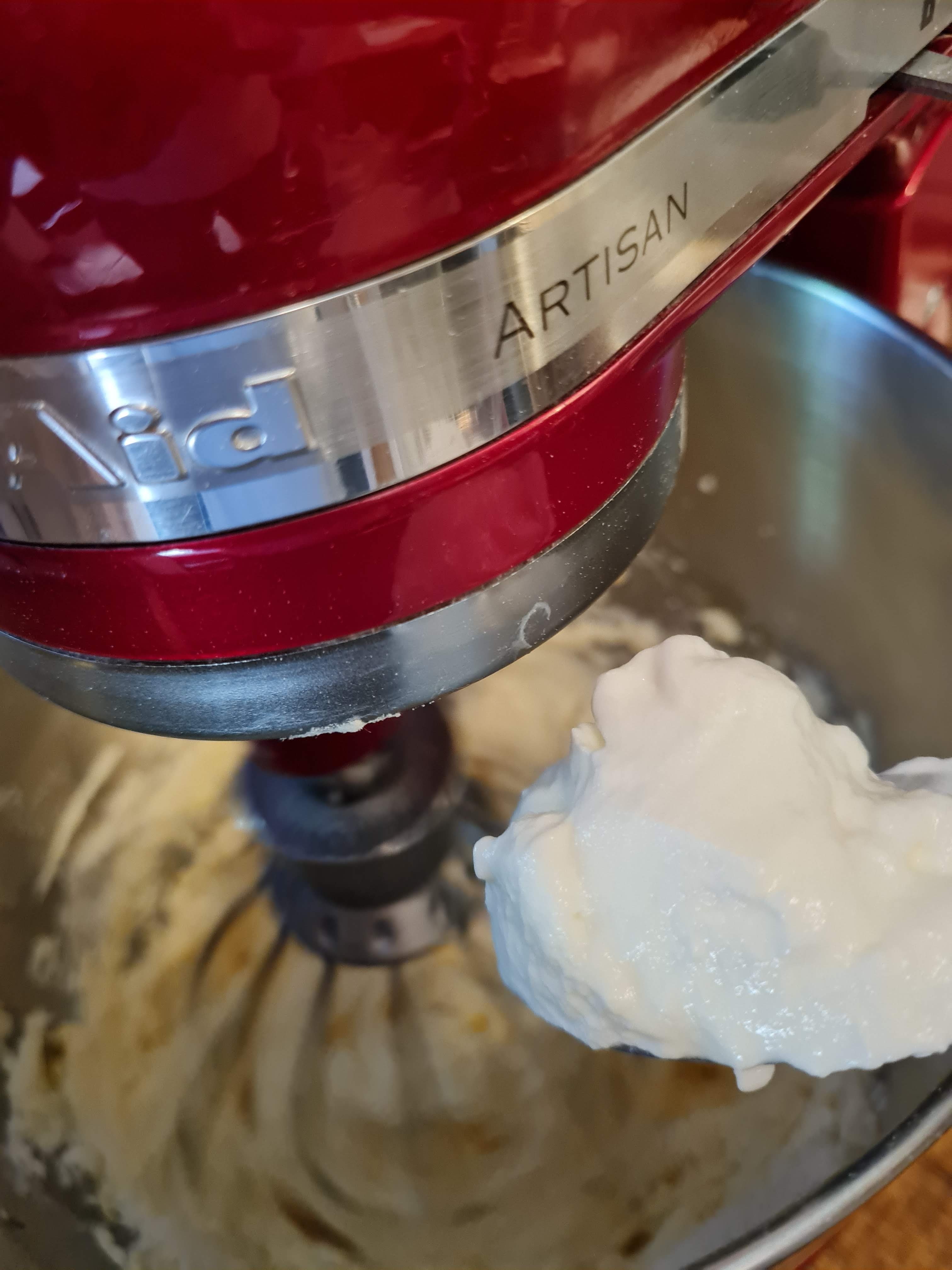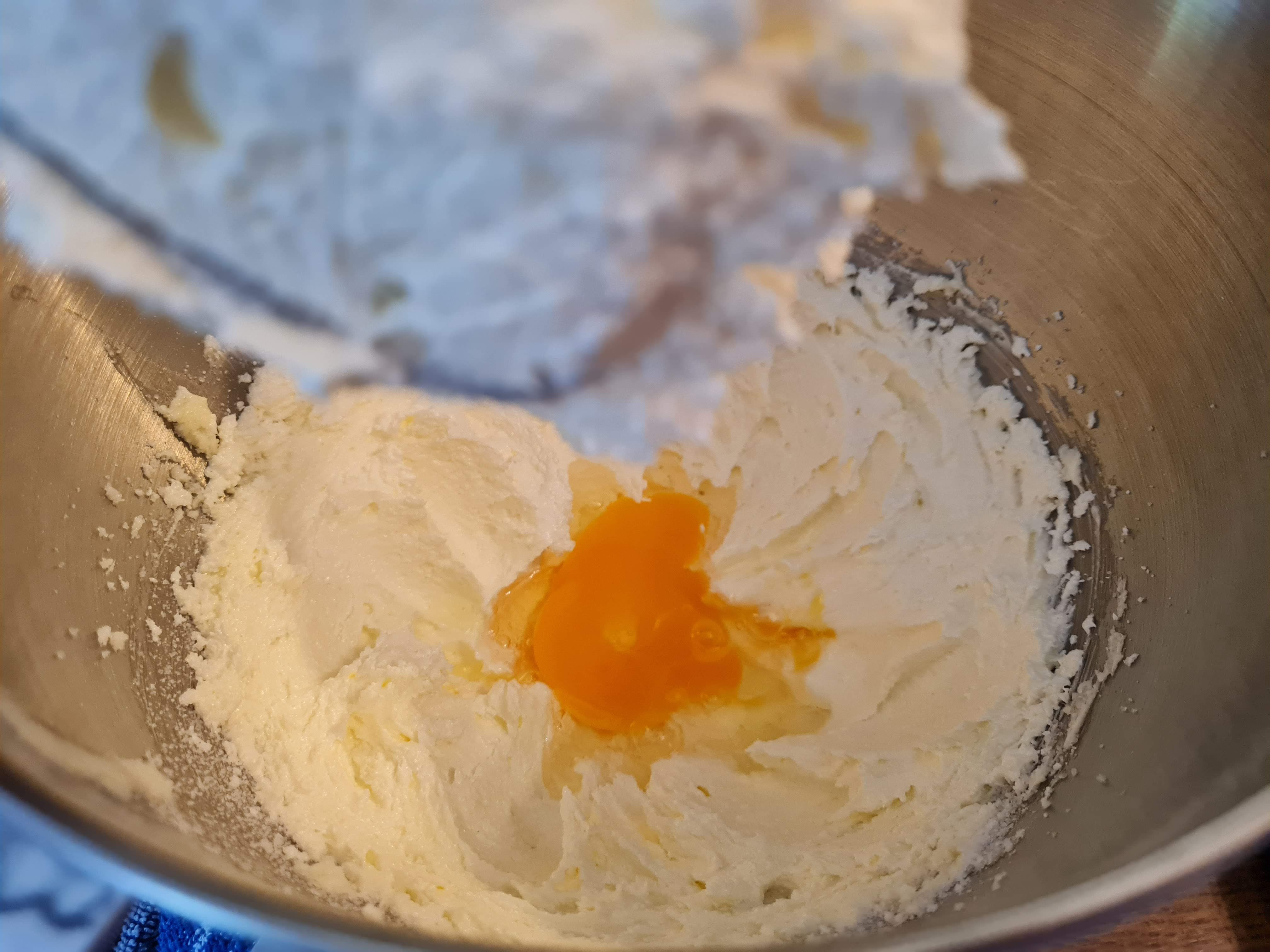 Намалявам мощността на миксера и започвам да добавям едно по едно яйцата. Старая се това да става само, когато е усвоено всяко едно яйце от крема. И не увеличавам мощността на миксера, защото ще се пресече крема.