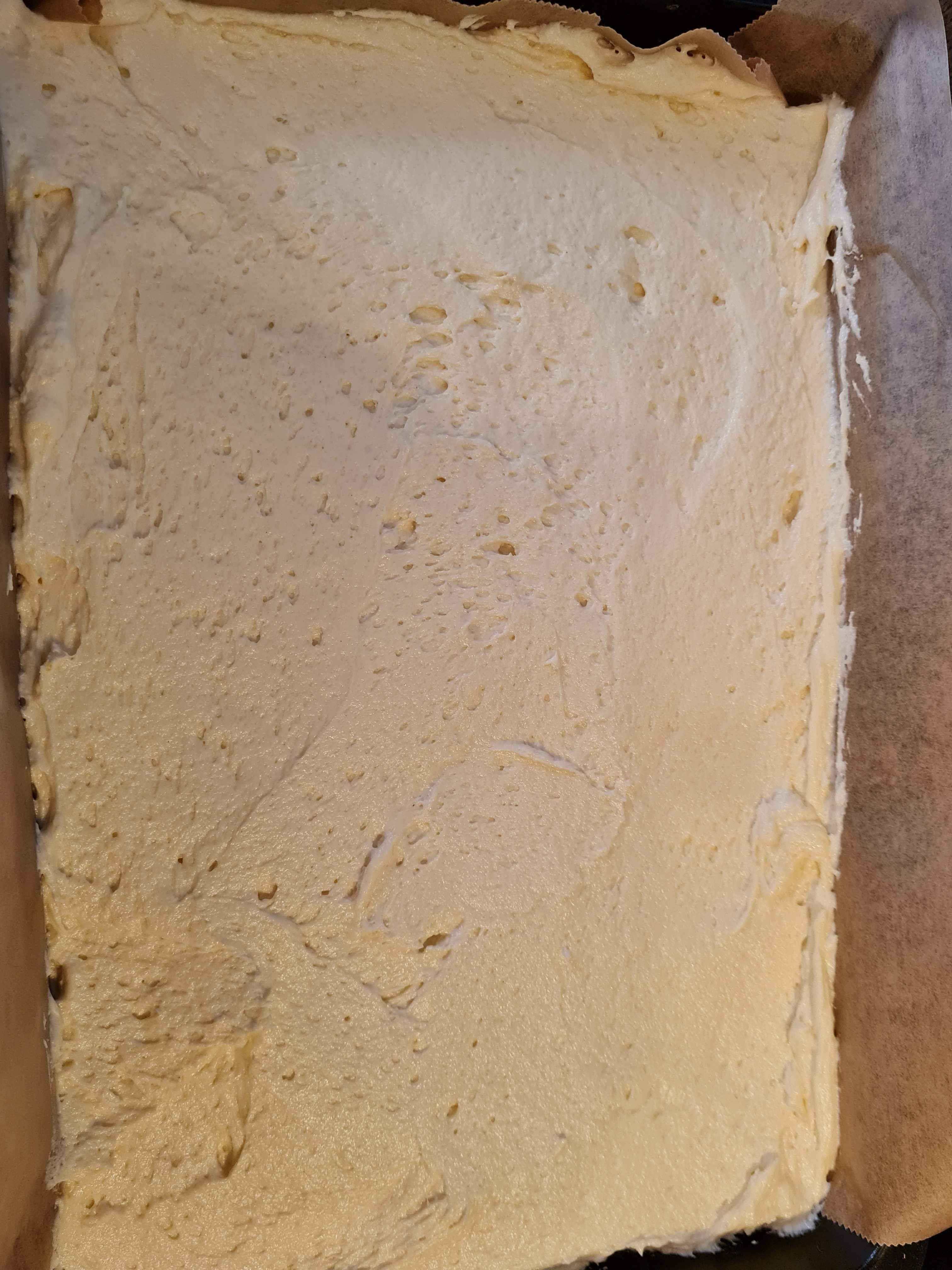 Готовото тесто за сладкиша изсипвам в тавичка с хартия за печене, а фурната загрявам предварително до 175 градуса с горно и долно печене.
