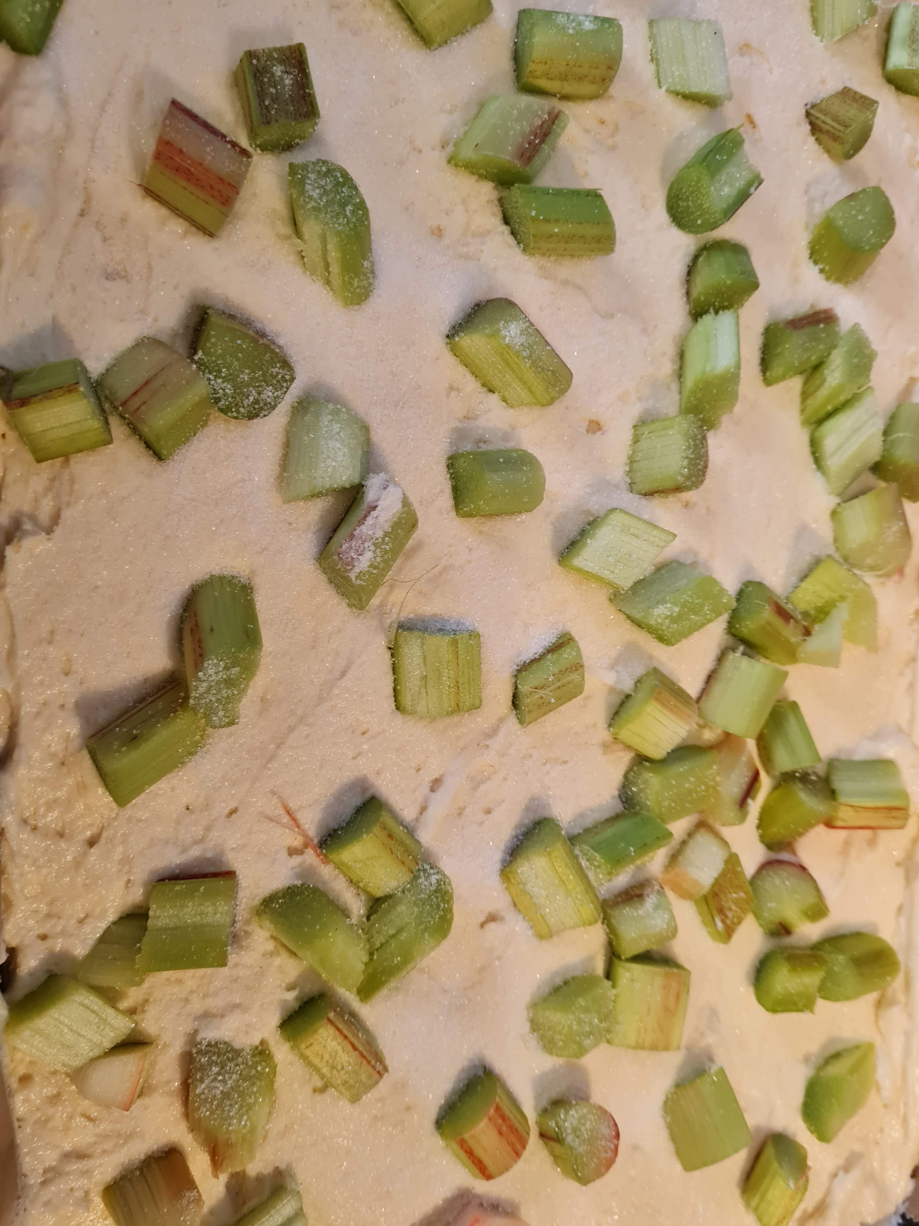 Подреждам върху тестото ревена, като леко го притискам (моят е около 300 г срлед обелването.