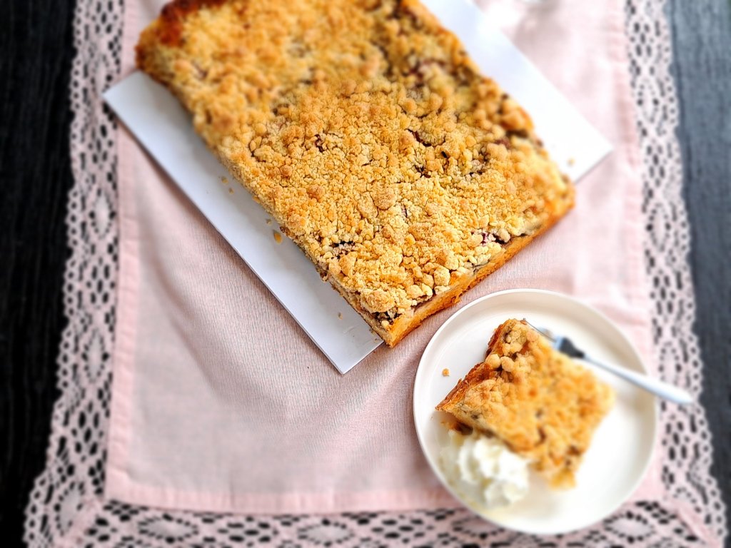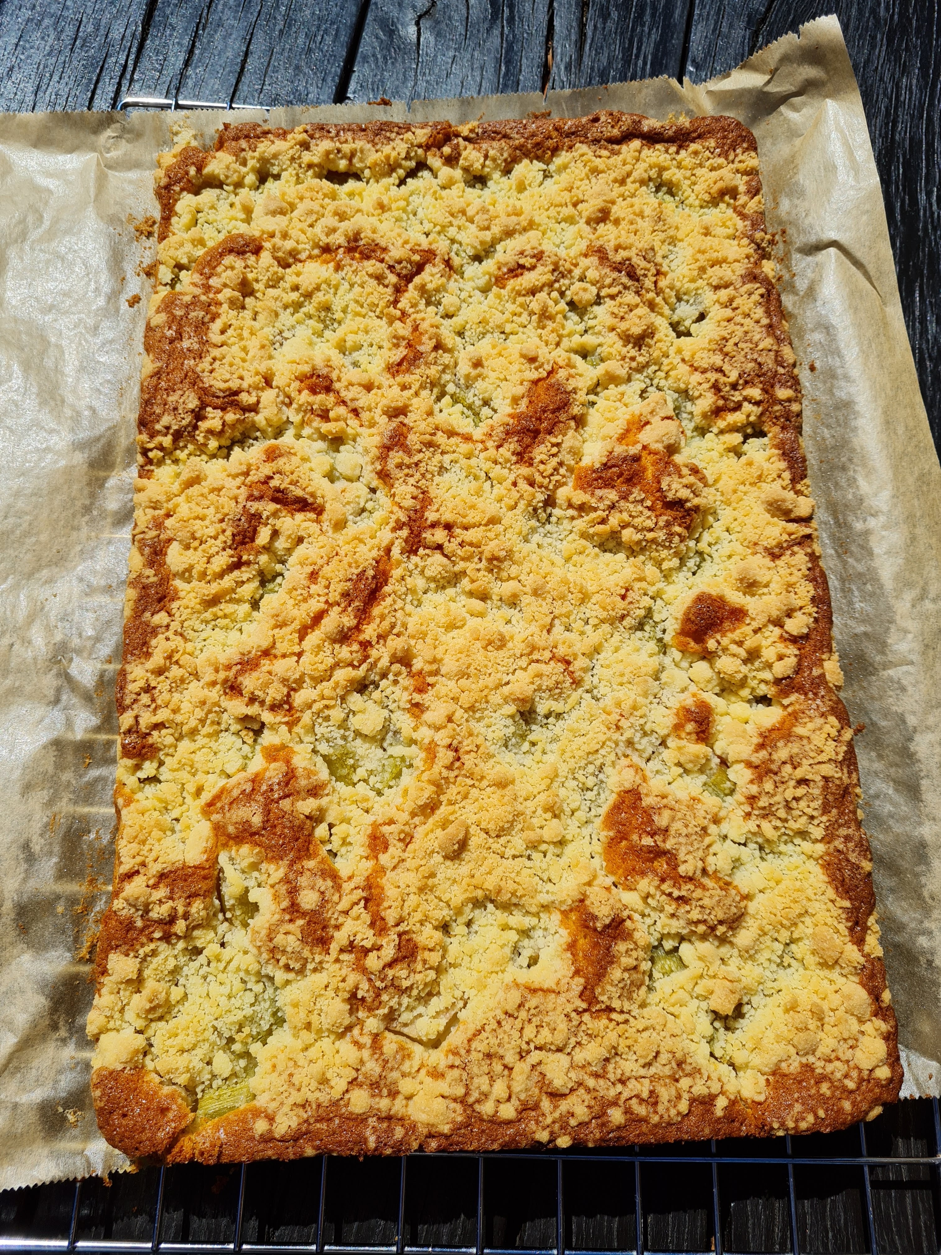 Нейнната немска свекърва е много добра в приготвянето на сладкиши с ревен и препоръката е да е или с вкусни и хрупкави трохи, или с пудингов крем. Разбитите белтъци също са много подходящи (рецепта има тук).