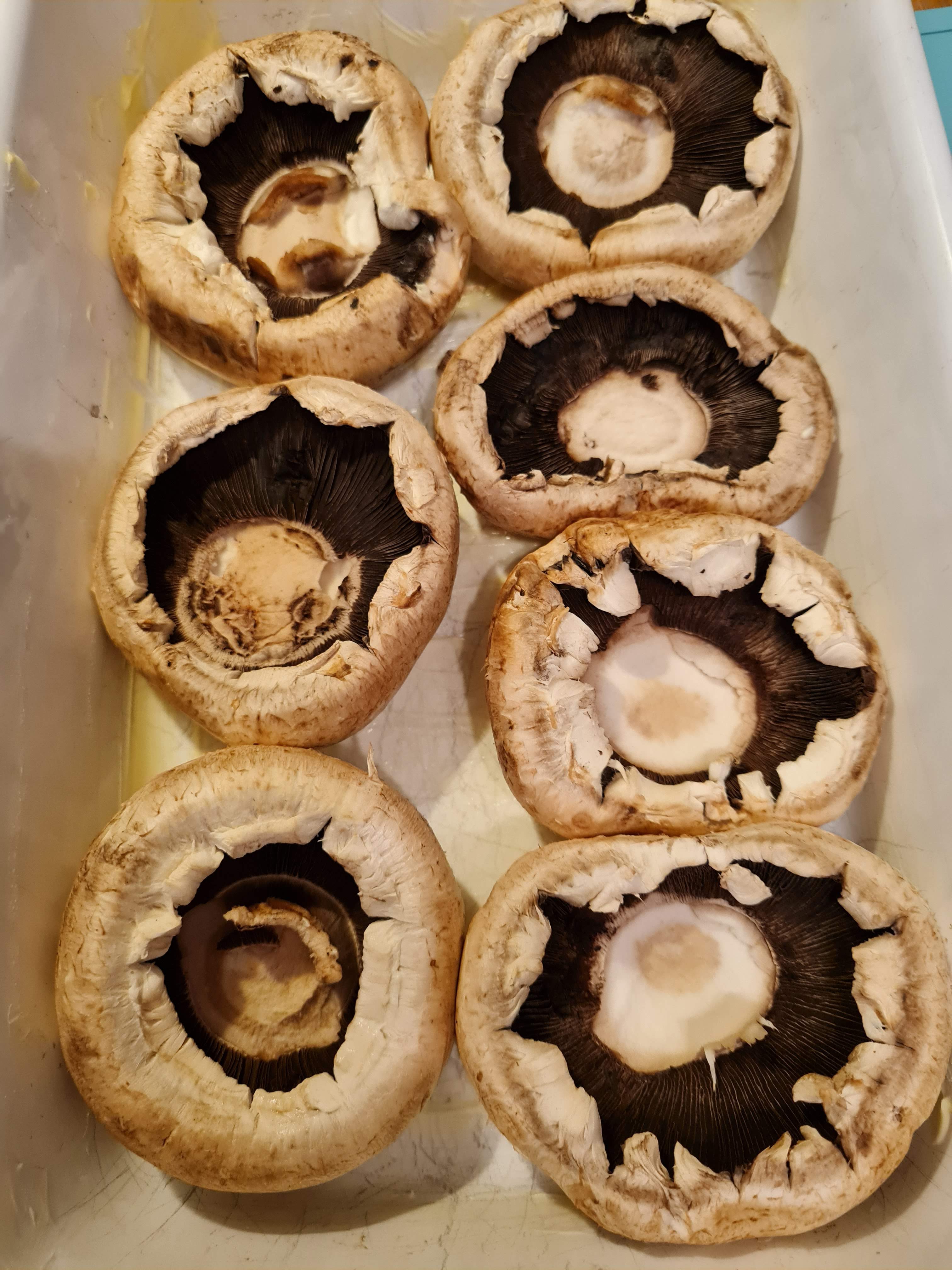 Намазвам подходяща тавичка с мазнина и подреждам големите гъби с отвора нагоре.