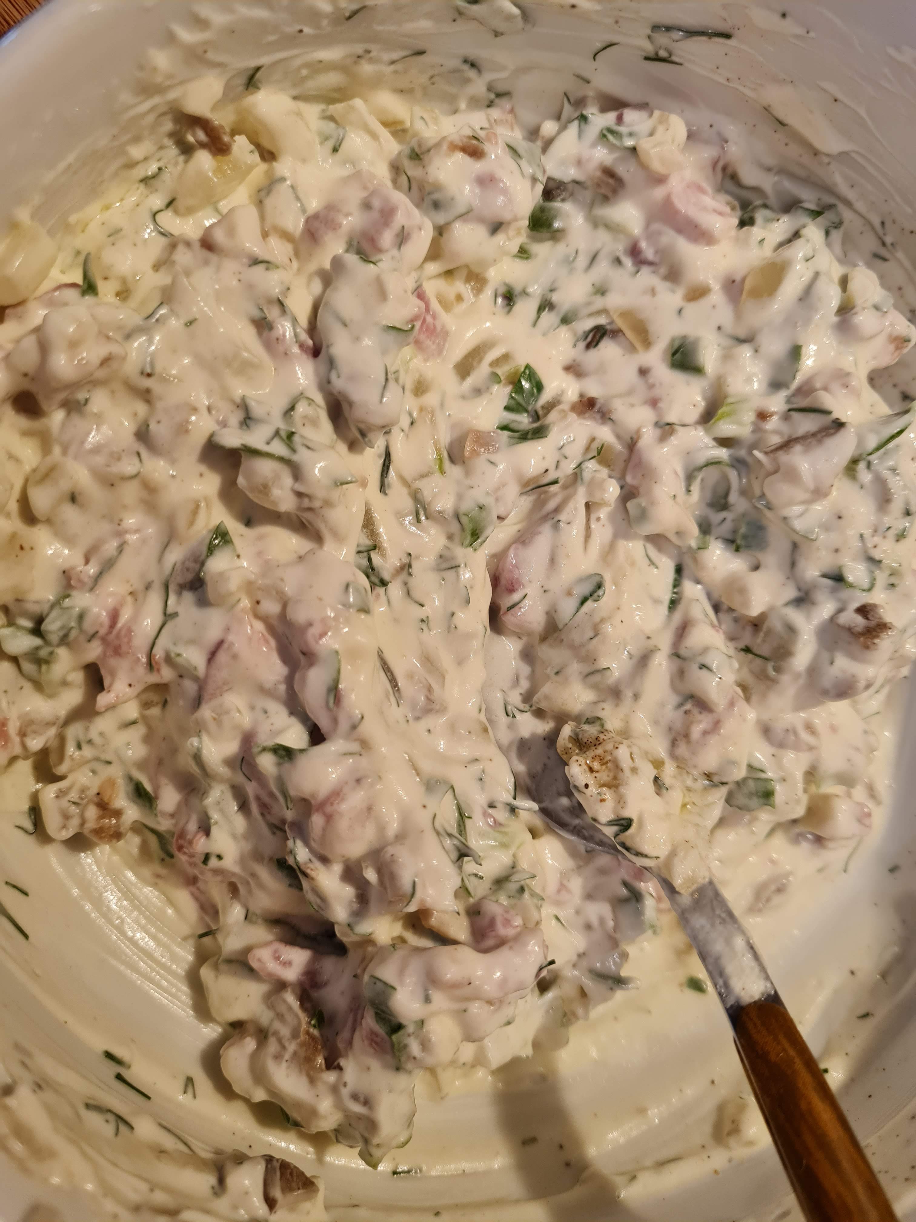 В купа разбивам сметаната и добавям изпържените и леко охладени продукти. Подправям на вкус със сол, пипер и зелените подправки. Внимавам със солта, защото бекона при нас е солен.