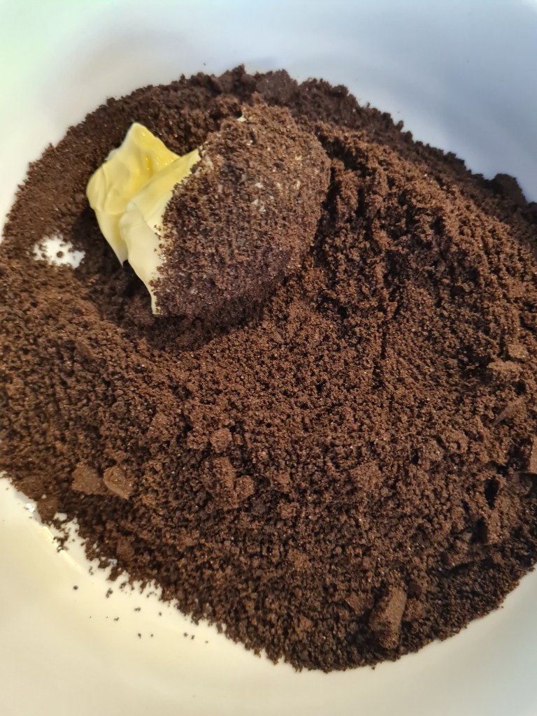Върху стегналия крем поръсвам отделените трохи от орео.