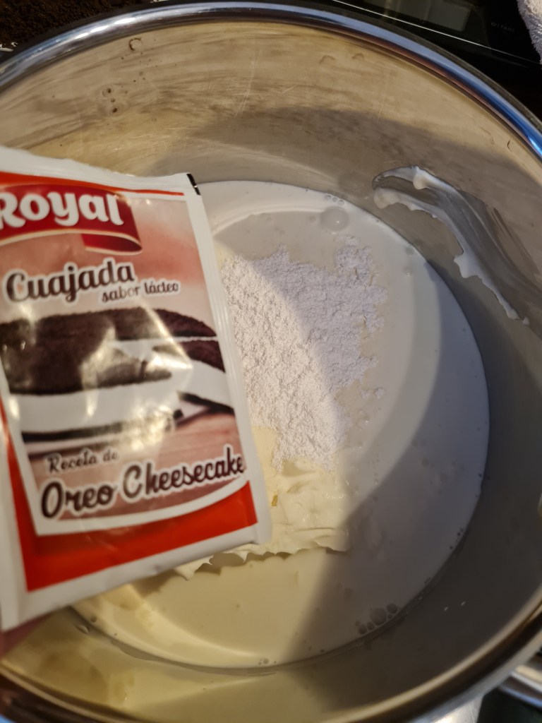 За крема изсипвам първо сметаната в тенджерка и в нея разтварям прахчетата куахада (или пък пудинг).