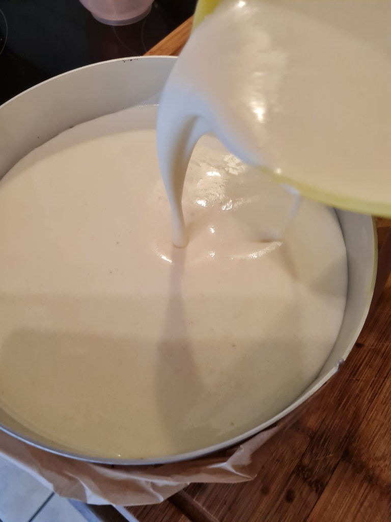 Готовата и гореща смес изсипвам върху стегналите бисквити.