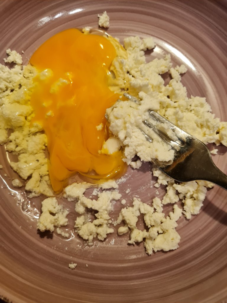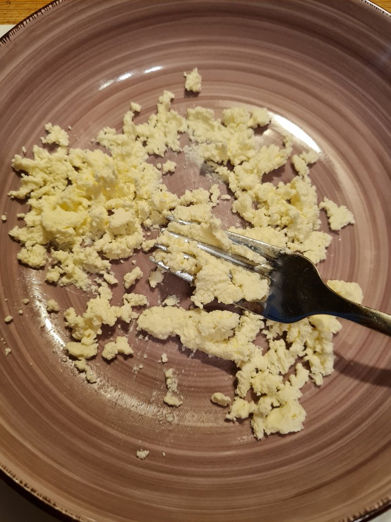 Сиренето намачквам с вилица до гладка каша. Хубаво е да е много добре отцедено.