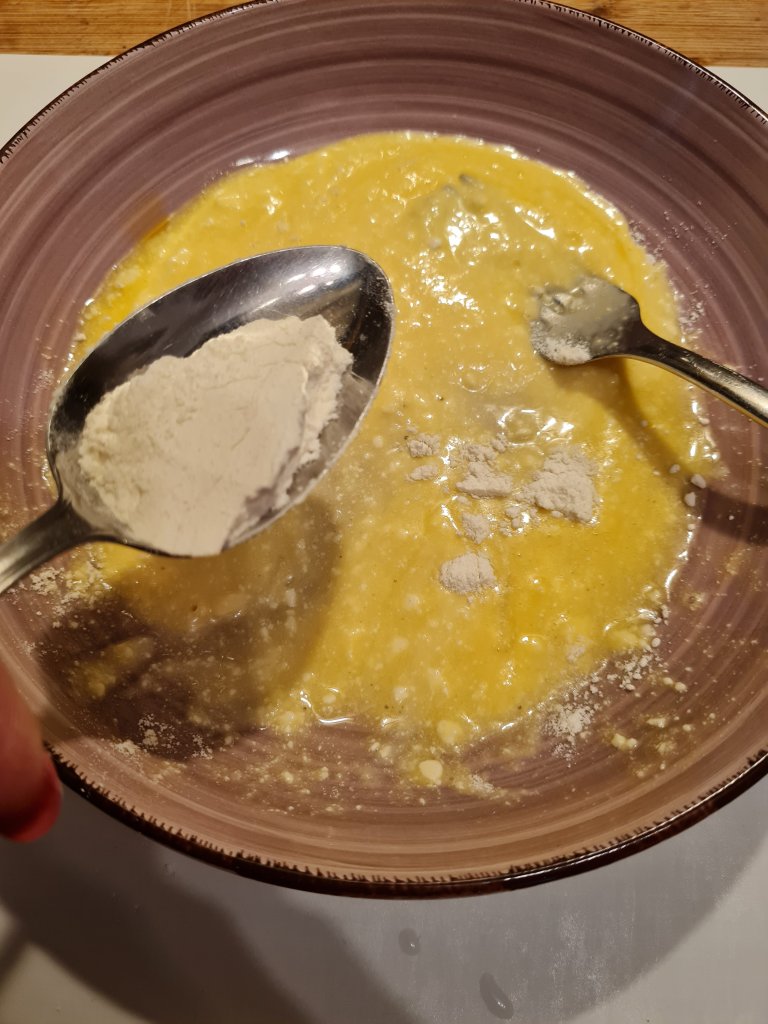 Най-накрая добавям малко по малко от брашното и разбивам с вилицата до гладка и рядка каша.