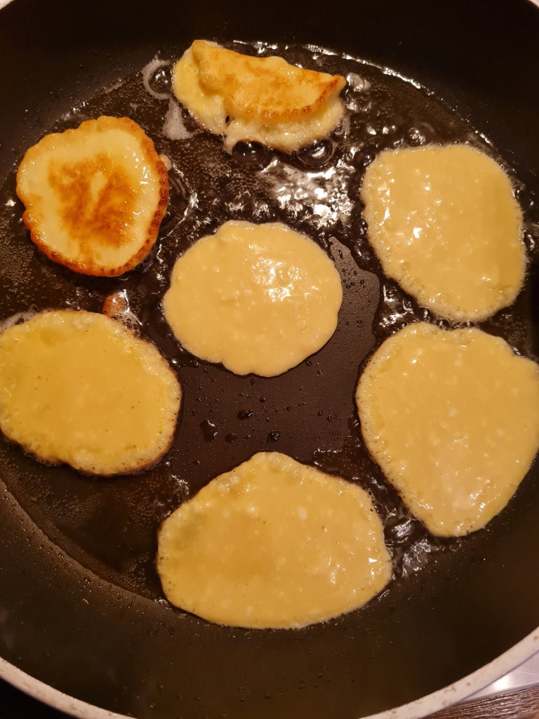 Щом видя, че краищата на тиганиците стават златисти, обръщам с лопатка.