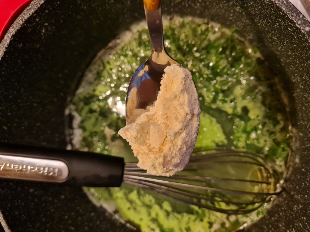 Добавям лъжица по лъжица царевичното брашно и разбърквам с тел. Всичко е извън котлона.