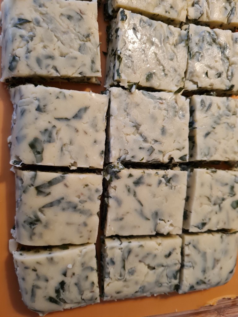 После обръщам върху дъска за рязане и нарязвам на квадратчета с размер 3х3 см.