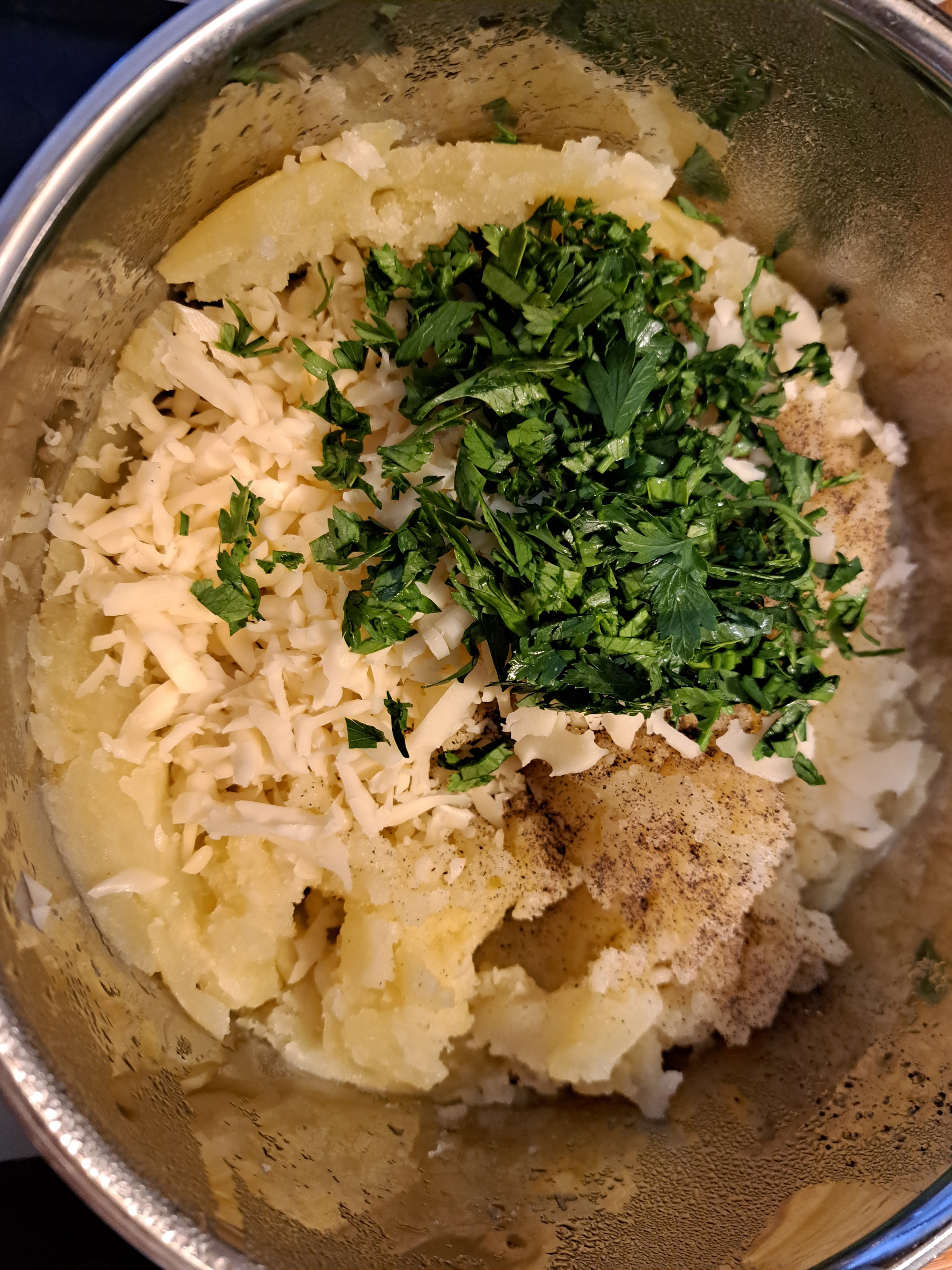 Намачквам картофите, добавям настърган кашкававл, нарязан на ситно магданоз и подпраям със сол, черен пипер, червен пипер.