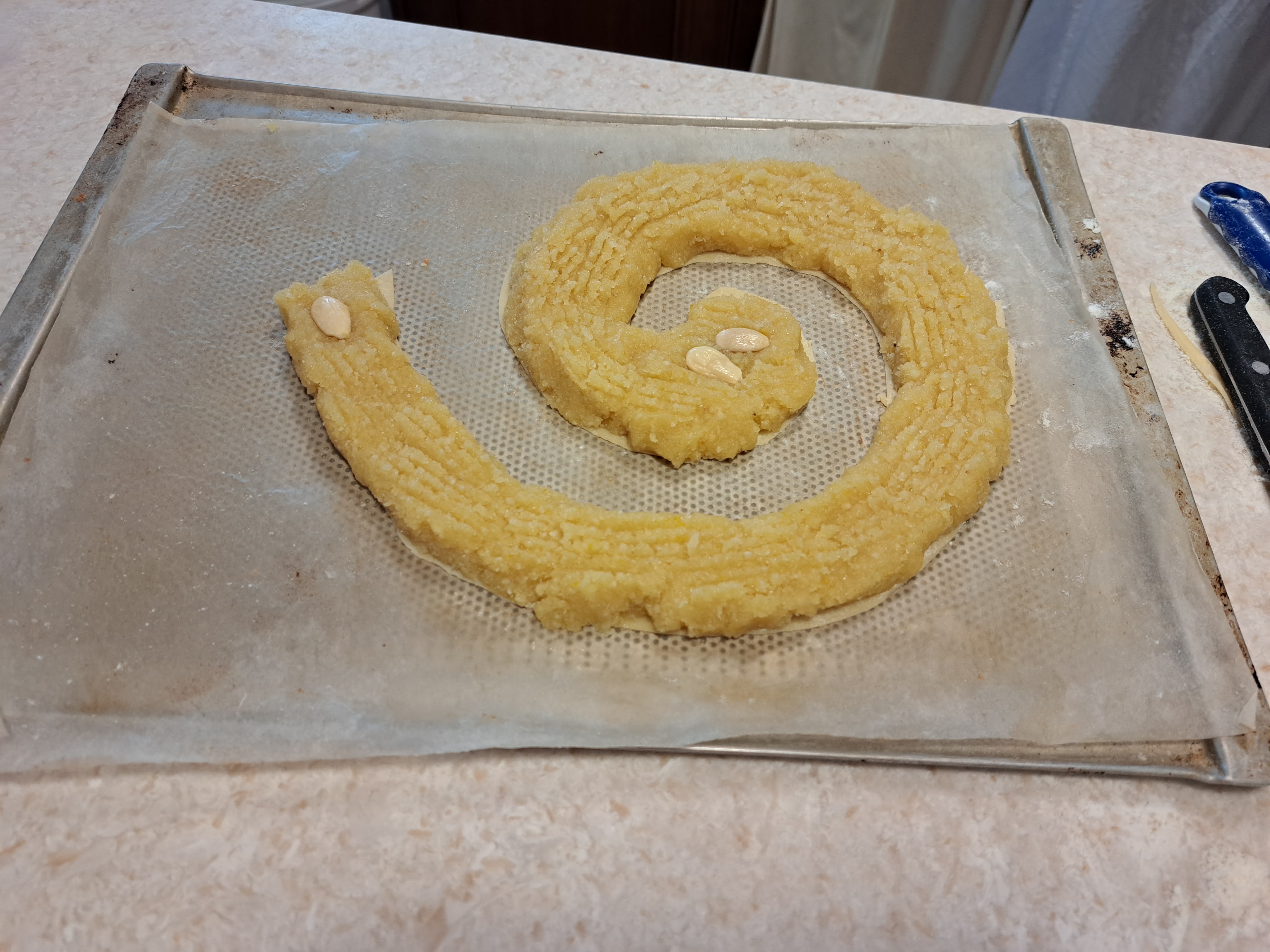 Върху охлюва от тесто се слага дебело количество от плънката така, че да има височина поне 2 см.