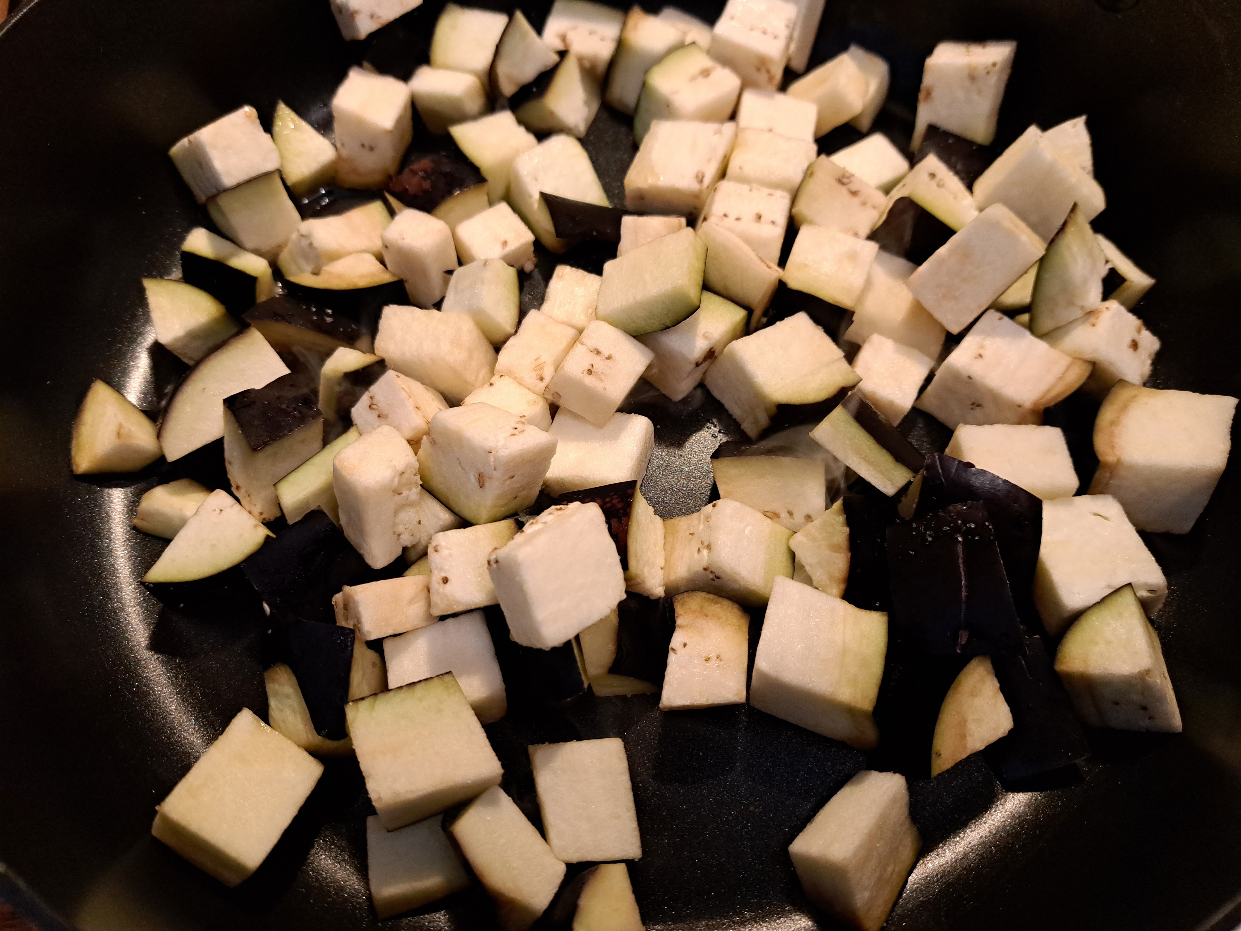 Загрявам 2 с. л. зехтин (олио) в тиган и изпържвам кубчетата патладжан за около 5 минути. После ги изваждам.