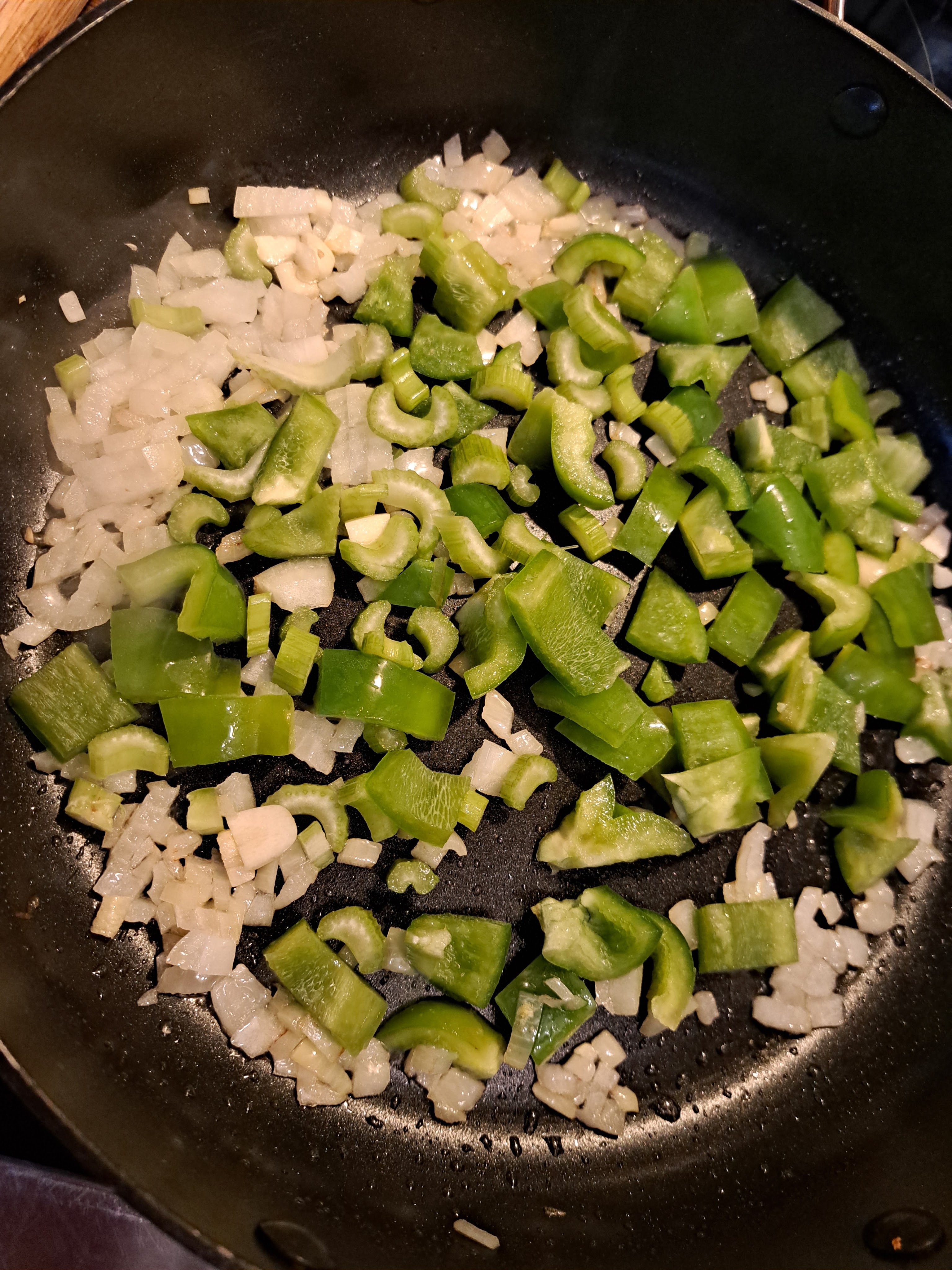 В същия тиган отново сипвам 1 с. л. олио и в него изпържжвам за кратко нарязания на ситнно кромид лук и нарязания чесън. Добавям и нарязаната на ситно чушка.