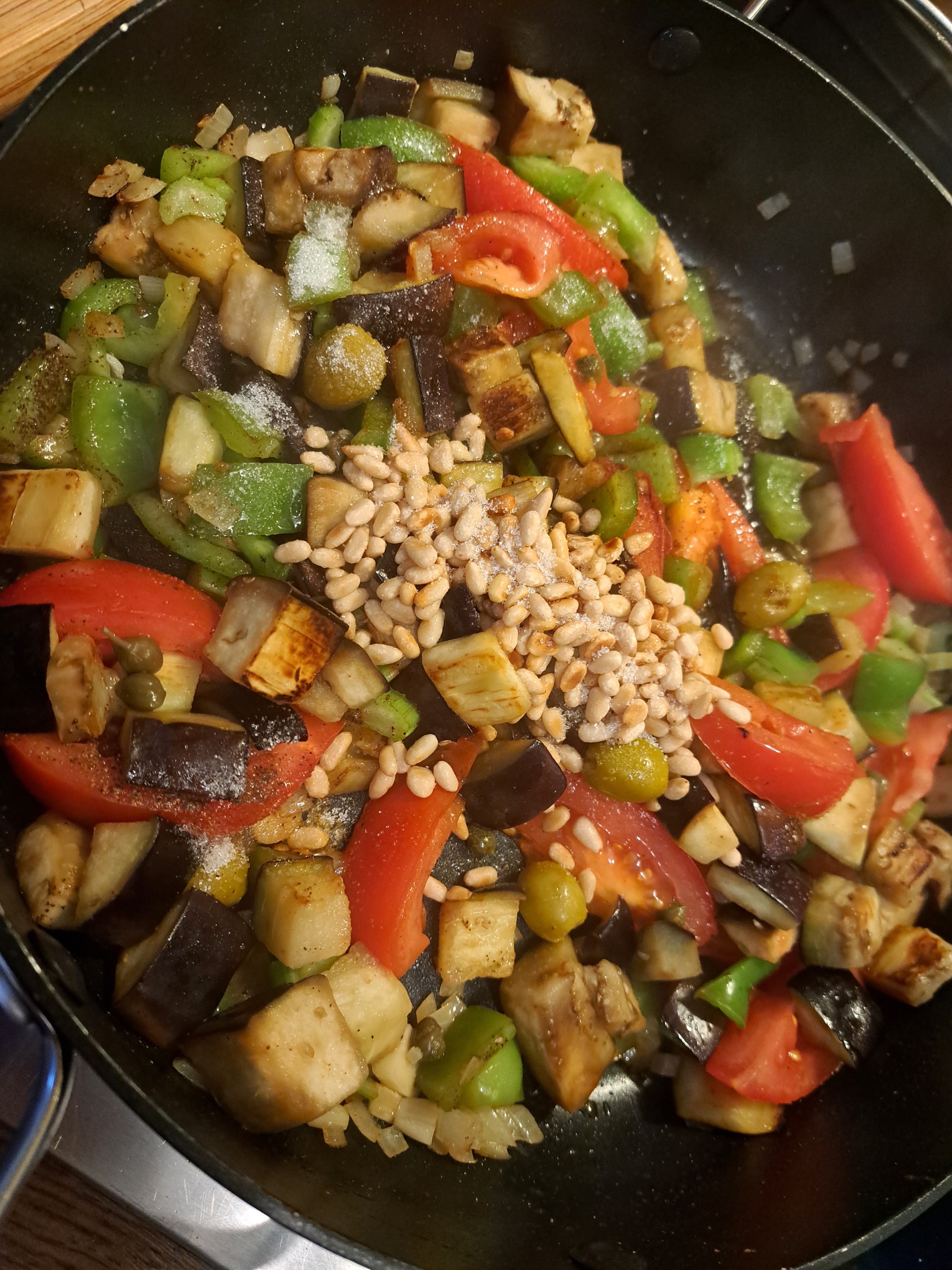 После връщам патладаните в тигана, добавям каперсите, кедровите ядки, поръсвам със захартаи поливам с оцета. Всичко оставям да си къкри на слаб котлон около 20 минути.