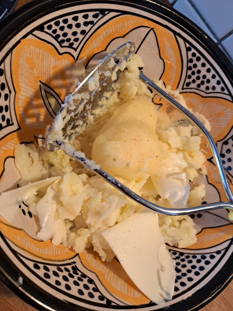 Сварявам картофите с обелките, обелвам ги след леко охлаждане и намачквам на пюре заедно с маслото, прясното мляко и сол на вкус. Варят се с обелките, за да не стане воднисто пюрето. Картофите без обелки поемат много повече от водата, а воднистото пюре ще се отрази на корите за баница.
