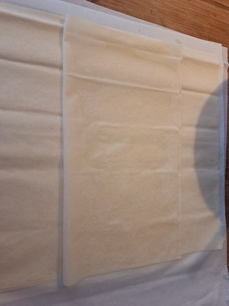 Сгъвам кората така, че да се получи квадрат, затворен от всички страни и без да има възможност плънката да се разтече. Намазвам между сгъванията с масло.